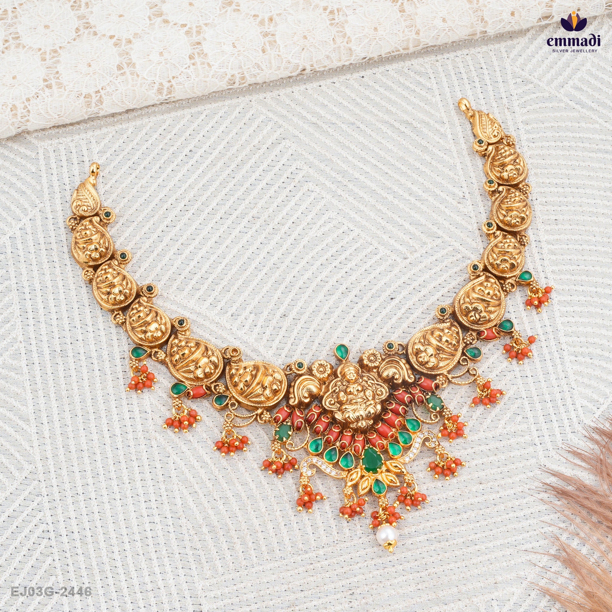 Introducing the exquisite Devi Pagadam: Nakshi Necklace in vibrant green, an enchanting piece that effortlessly elevates any ensemble. Crafted with meticulous attention to detail, this stunning necklace celebrates the traditional nakshi art form, showcasing intricate designs that evoke a sense of timeless elegance.