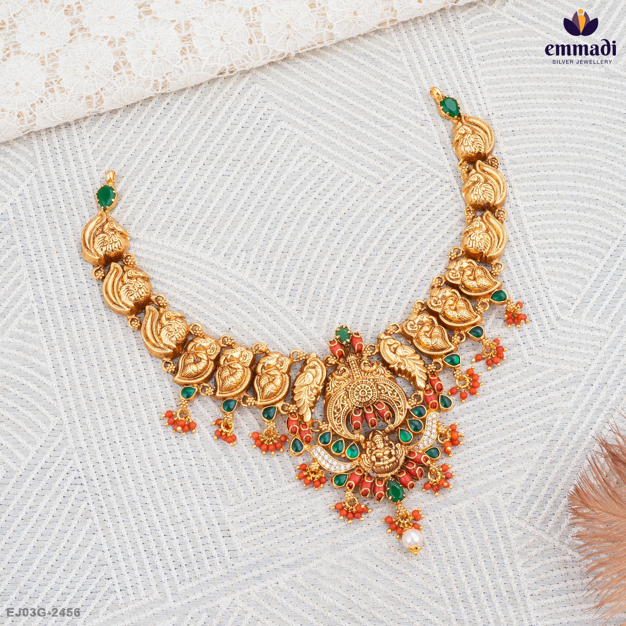 The necklace is designed to captivate attention, with an elaborate display of motifs inspired by nature, symbolizing growth and harmony. The interplay of shades of green within the nakshi creates a serene aesthetic that is perfect for both casual and formal occasions. Each coral embellishment adds a pop of color, enhancing the necklace’s overall brilliance and appeal.
