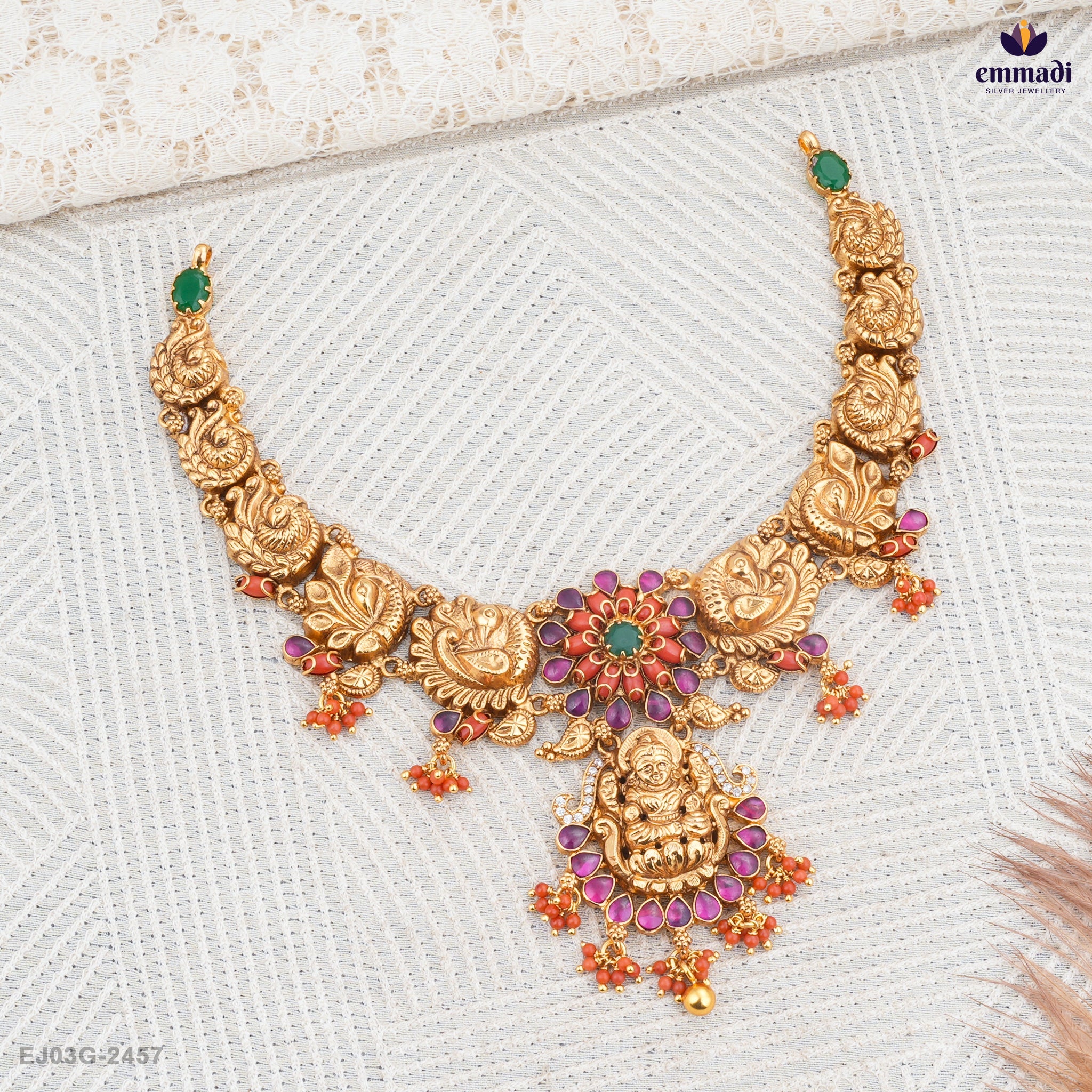 Immerse yourself in the rich artistry of our exclusive collection, Pagadam, featuring the exquisite "Necklace Nakshi" adorned with vibrant corals. This striking necklace showcases the timeless beauty of traditional nakshi craftsmanship, merging intricate designs with the enchanting allure of multi-colored coral accents.