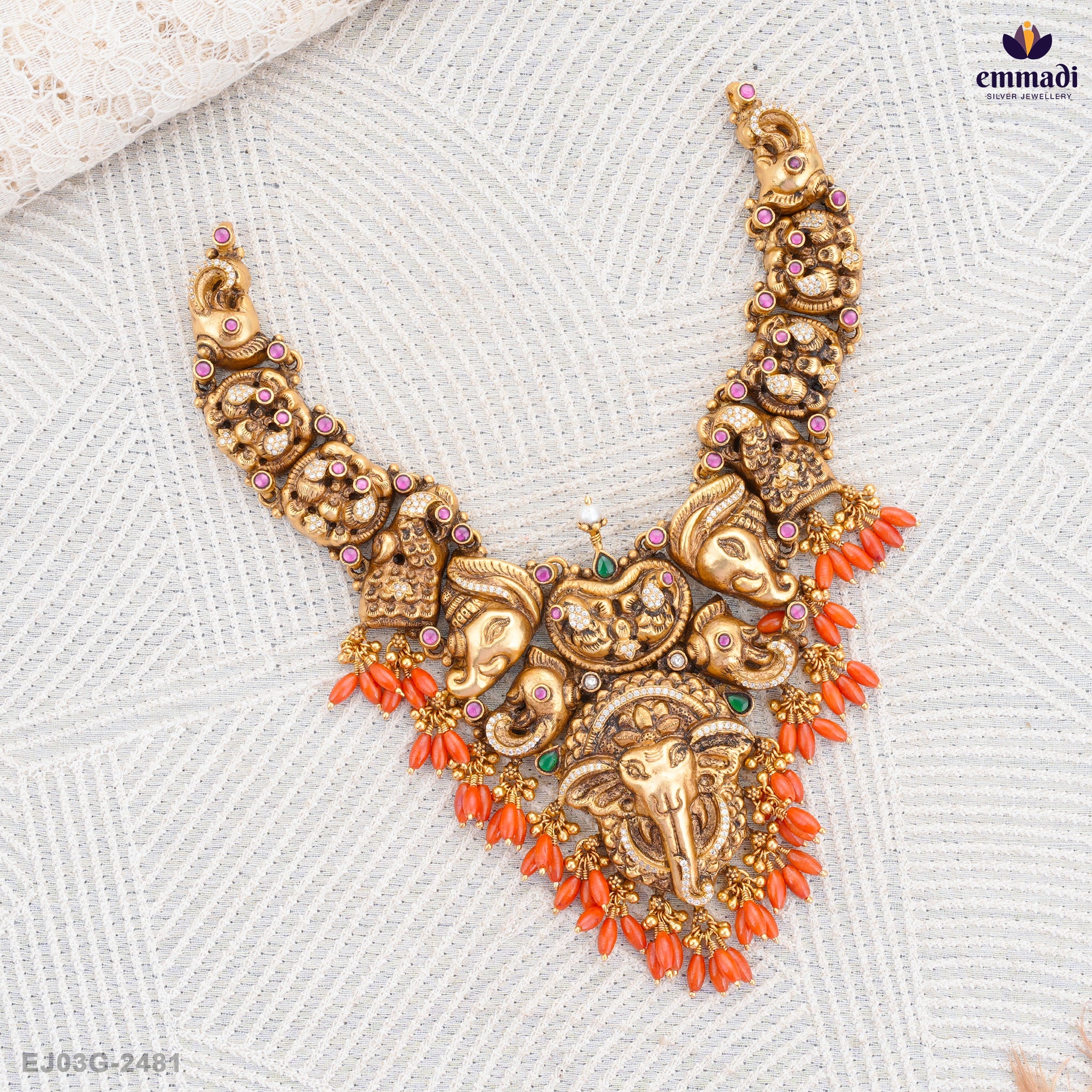 The nakshi technique, revered for its detailed craftsmanship, emphasizes artistry and precision. This necklace captures the essence of cultural heritage, adorned with meticulously crafted motifs that tell a story of grace and elegance. The rich hues of the multi-colored corals evoke a sense of vitality, making it a perfect accessory for any occasion—from festive celebrations to elegant evening gatherings.
