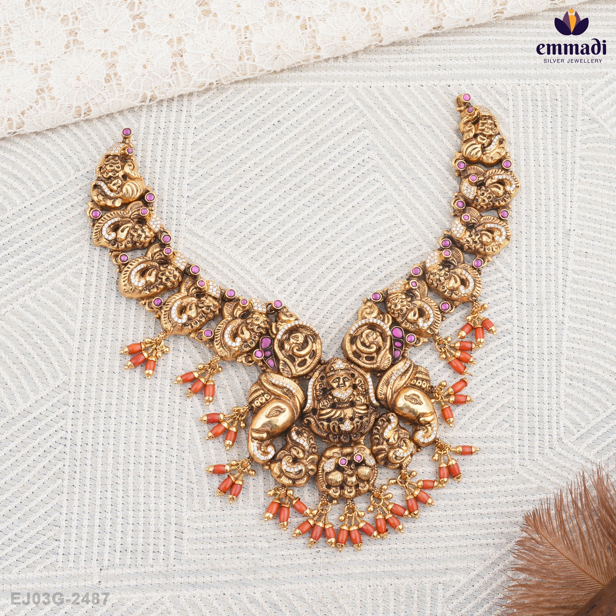 The Necklace Nakshi stands out for its breathtaking use of multi-colored corals, adding a lively, vivid touch to the jewelry piece. The vibrant hues of red, orange, and pink corals blend harmoniously, creating a striking contrast against the intricately detailed metalwork. This necklace is not merely an accessory but a statement piece, perfect for various occasions, from festive celebrations to formal events.