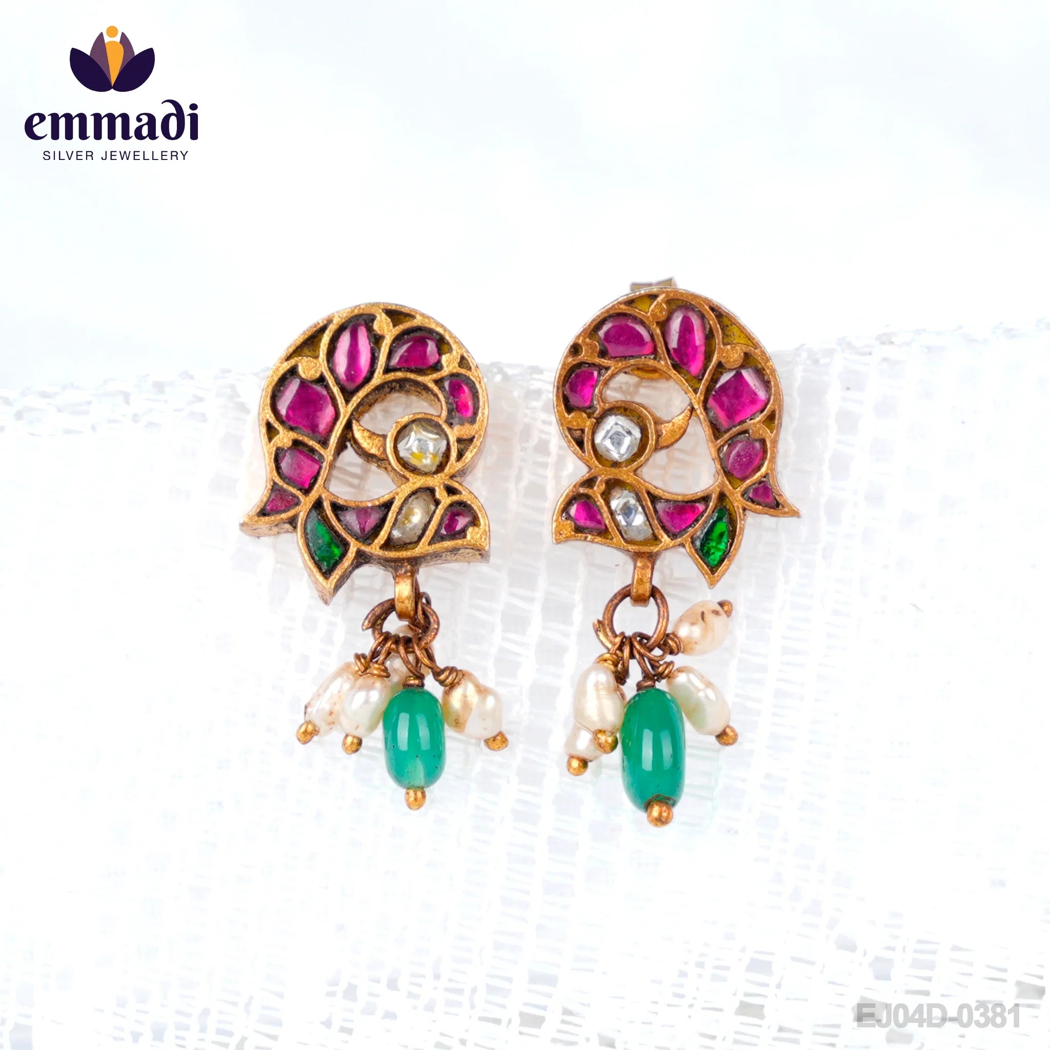 Emmadi Jewellers introduces the exquisite handcrafted HANGINGS KUNDAN RED earrings made with 92.5 silver and pure gold plating. The intricate designs and red kundan stones add a touch of elegance and traditional charm to any outfit.