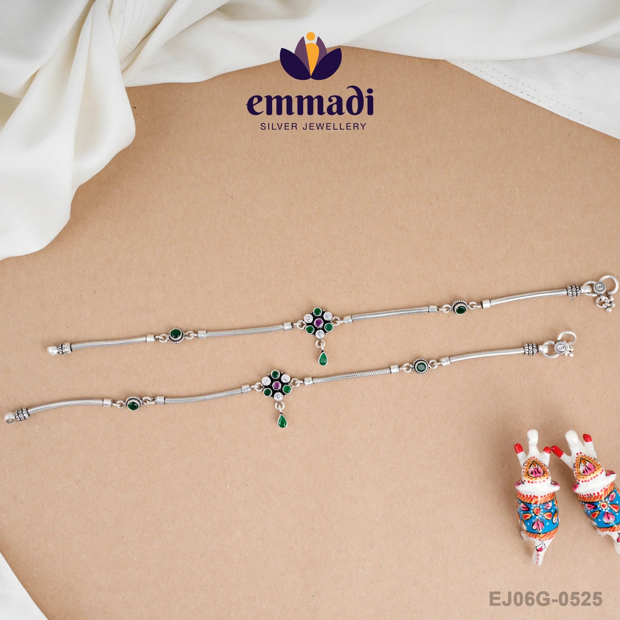 Elevate your ankle adornment with the exquisite Yaasana Stone Multi Anklets by Emmadi Silver Jeweller, India's Largest silver brand. Crafted with precision and grace, these anklets exude an aura of elegance and sophistication. Let the delicate stones shimmer with every step you take, adding a touch of luxury to your ensemble. Elevate your style effortlessly with these enchanting anklets, a true masterpiece for the discerning fashion connoisseur.