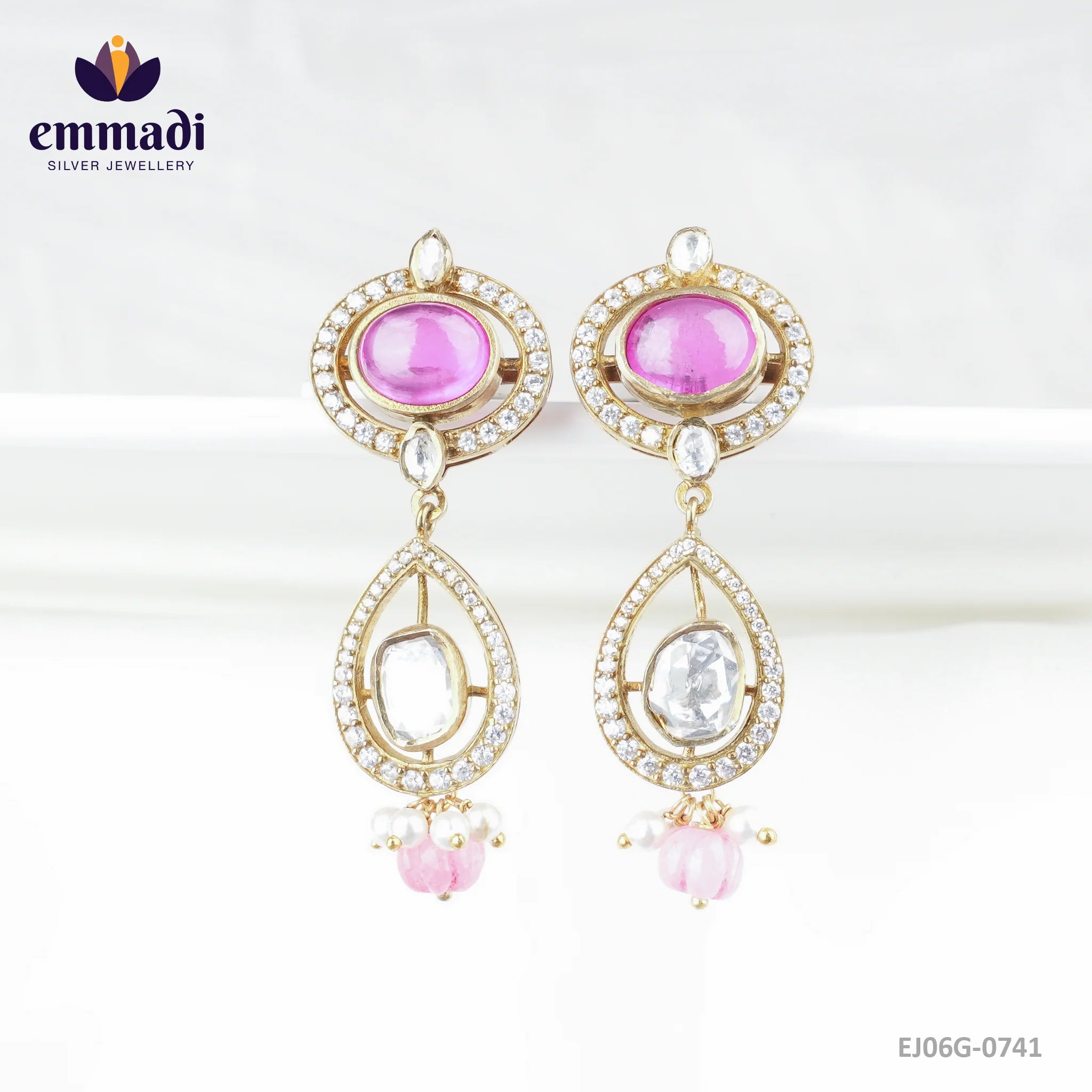 Indulge in the exquisite allure of the Anjaneya Victorian Pink Hangings. Crafted by Emmadi Silver Jeweller, India's Largest silver brand, these elegant earrings are a nod to Victorian opulence. The shimmering pink stones effortlessly blend with the intricate silver detailing, adding a touch of luxury to your ensemble. Elevate your style with these statement earrings, perfect for special occasions where sophistication is key. Experience the timeless beauty of Victorian elegance with every wear.