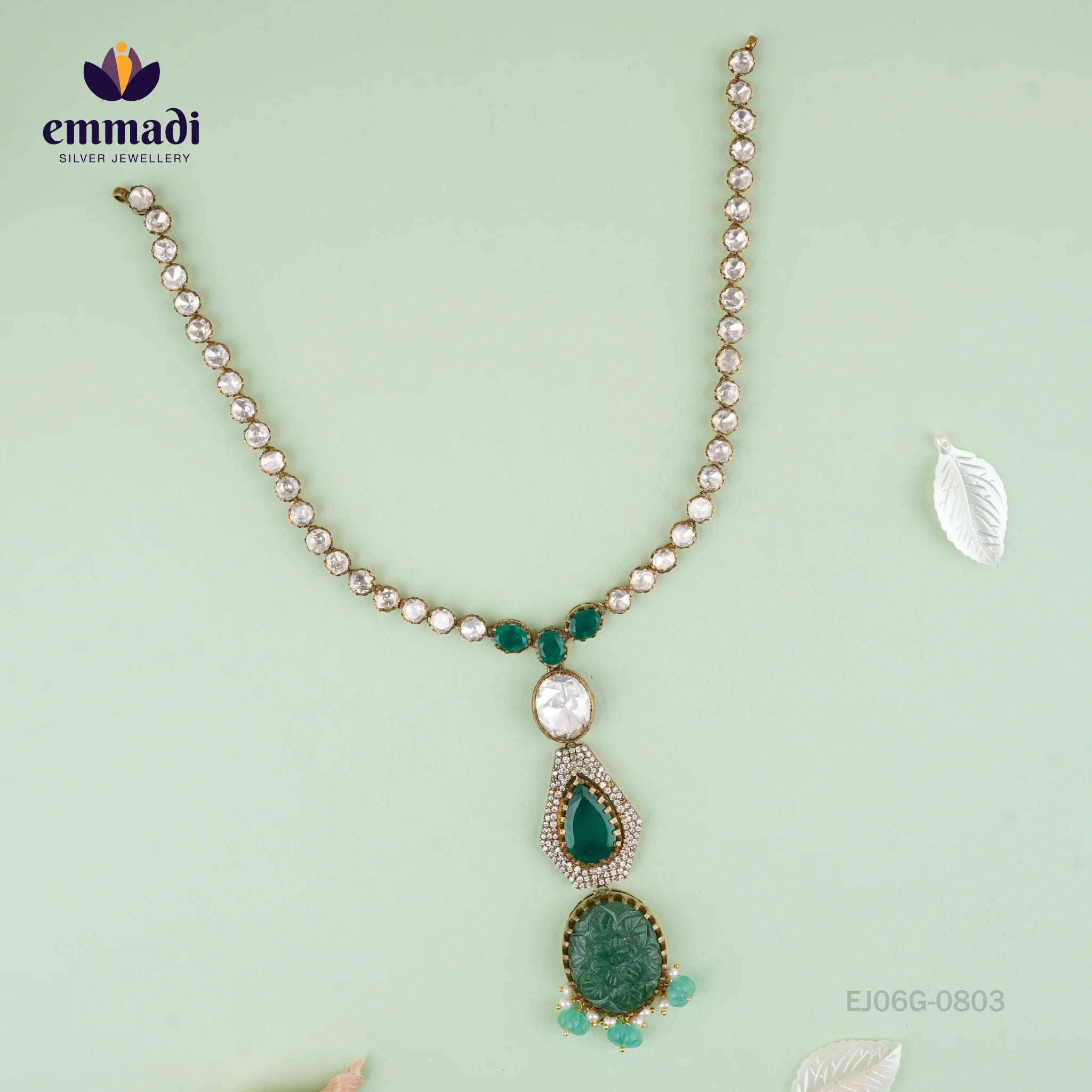 Indulge in opulence with the Bhairava Victorian Green Chain, a stunning masterpiece from Emmadi Silver Jeweller, India's Largest silver brand. This exquisite chain exudes Victorian elegance with its intricate design and captivating green accents. Elevate your style to new heights with this symbol of luxury and sophistication. Adorn yourself with the ultimate statement piece and radiate unmatched glamour wherever you go. Enhance your ensemble with a touch of royalty; let the Bhairava Victorian Green Chain be your crowning jewel.