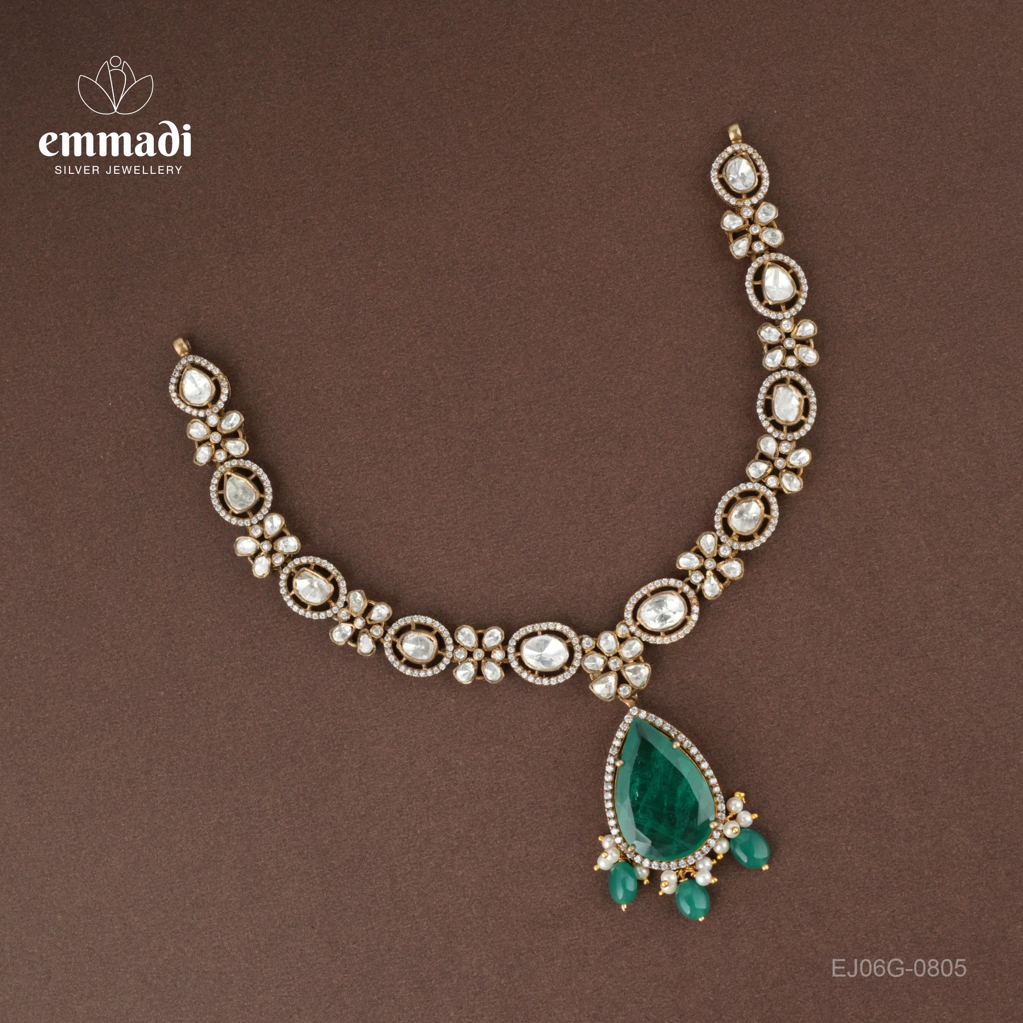 Indulge in the allure of the Bhara??a Victorian Green Necklace, a stunning masterpiece by Emmadi Silver Jeweller, India's Largest silver brand. Elevate your style with this exquisite blend of elegance and sophistication. Handcrafted to perfection, this necklace exudes a regal charm that is sure to captivate admirers. Adorn yourself in luxury and make a bold statement with this magnificent Victorian-inspired piece.
