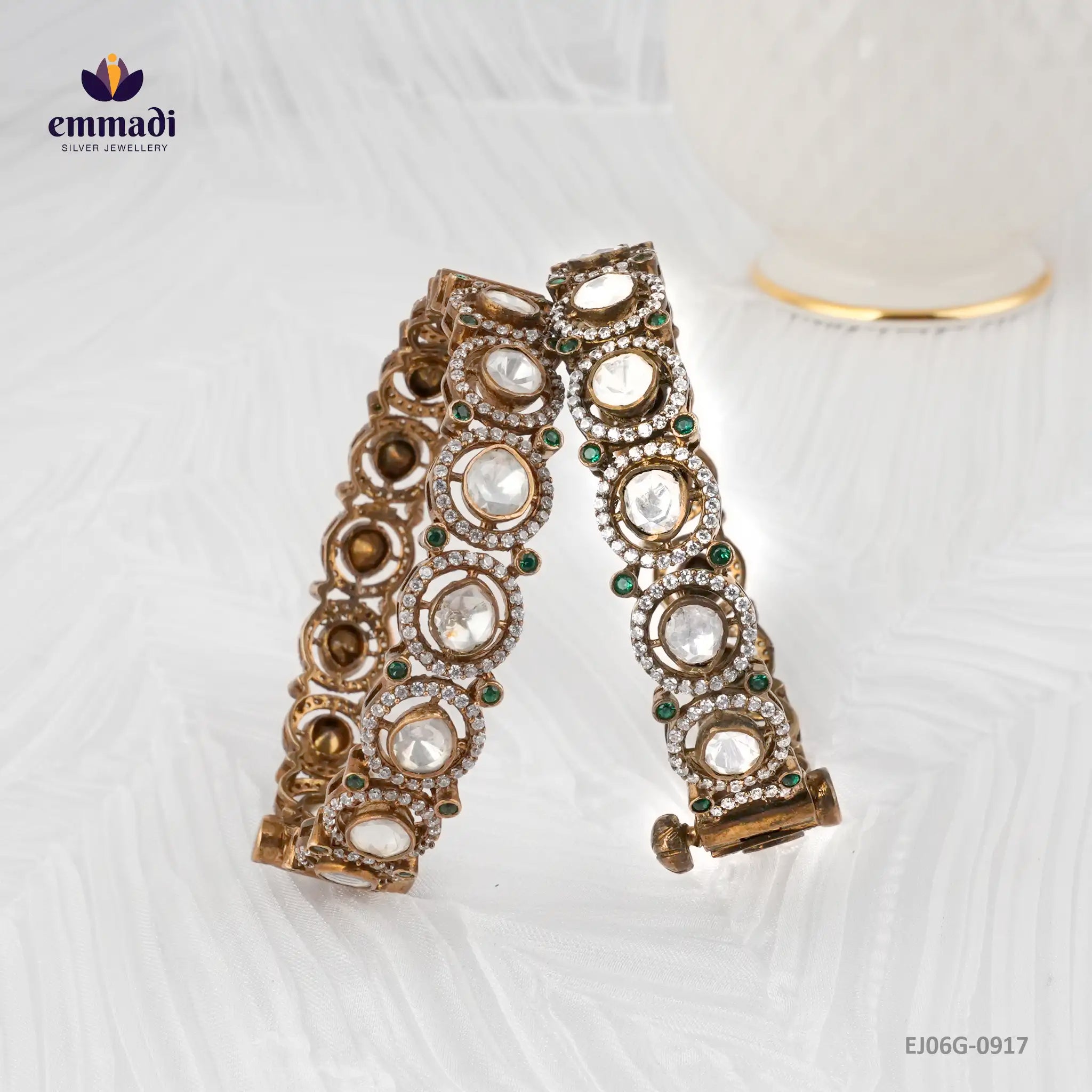 Step into a world of opulence with Chandika Victorian Green Bangles by Emmadi Silver Jewellery, India's Largest Silver Brand. Elevate your style with these exquisitely crafted bangles that seamlessly blend tradition with modernity. The timeless allure of these green bangles will envelop you in luxury and sophistication, adding a touch of glamour to any outfit. Radiate elegance and grace with these stunning accessories that are the epitome of style and refinement.