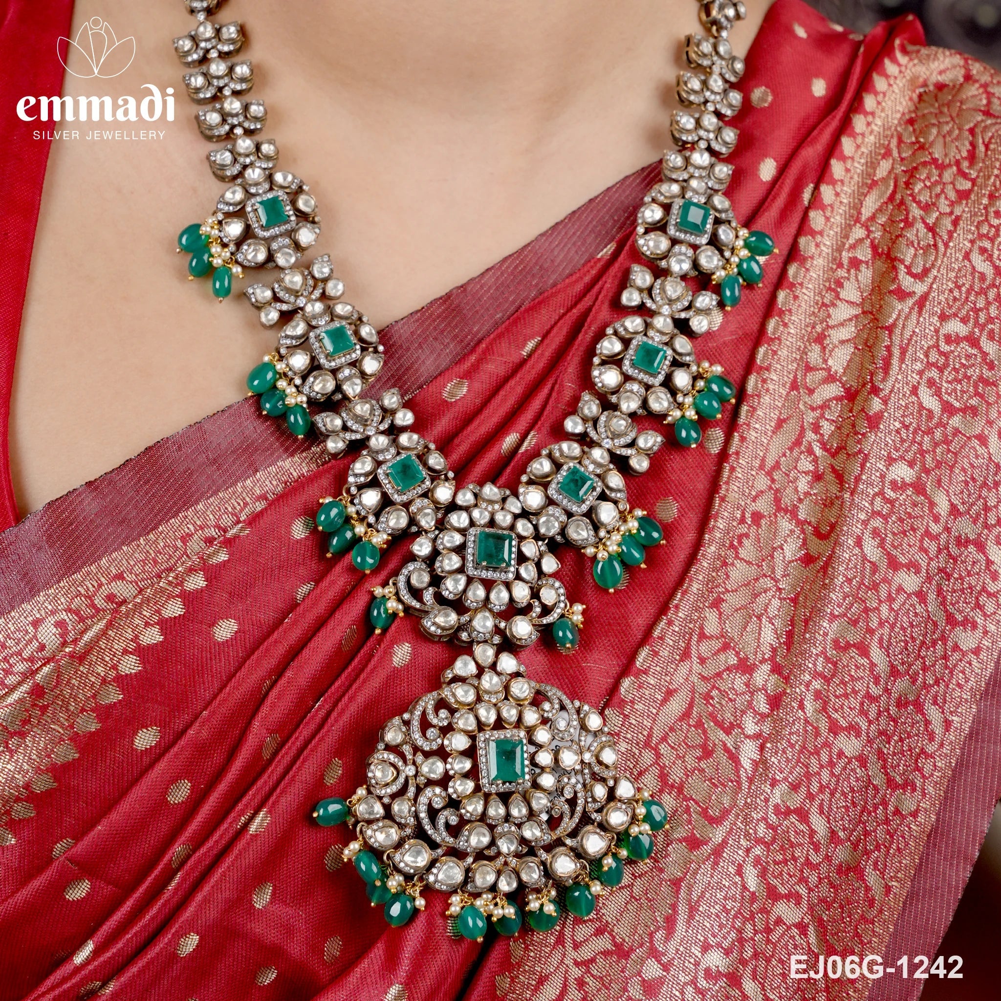 Indulge in the exquisite elegance of the Gurditta Victorian Green Long Necklace by Emmadi Silver Jeweller, India's Largest silver brand. This opulent piece exudes a Victorian charm with its intricate design and captivating green hues. Elevate your ensemble to new heights with this luxurious necklace that whispers sophistication and style. Immerse yourself in a world of timeless beauty and grace with this magnificent statement piece.