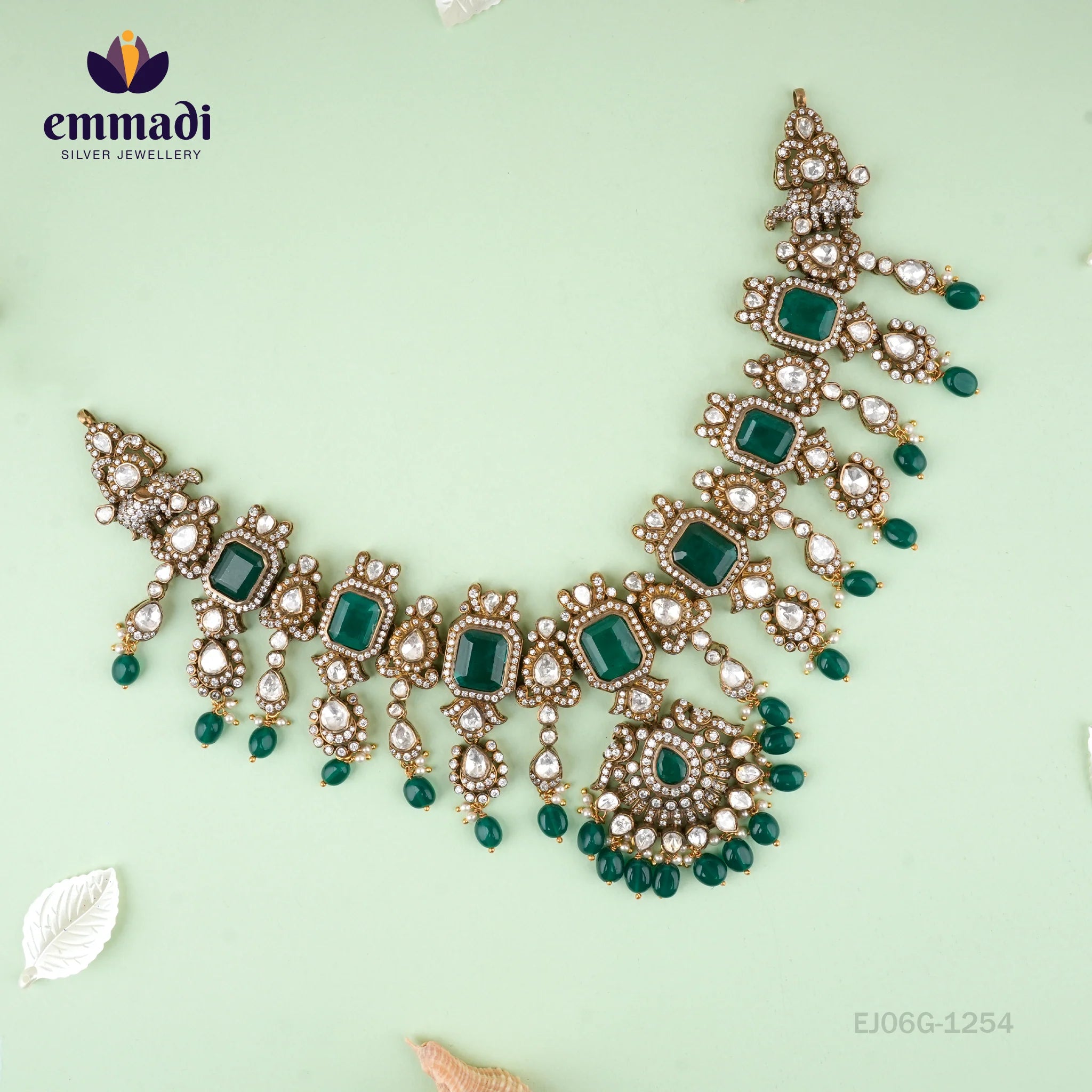Indulge in the opulence of the Harshada Victorian Green Necklace, a dazzling masterpiece by Emmadi Silver Jeweller, India's Largest silver brand. This exquisite necklace exudes elegance and sophistication, adorned with a mesmerising green stone that captures the essence of luxury. Elevate your style and make a statement with this impeccable piece that radiates timeless beauty and unparalleled craftsmanship. Embrace the allure of Victorian charm with this magnificent necklace and experience the epitome of sophistication.