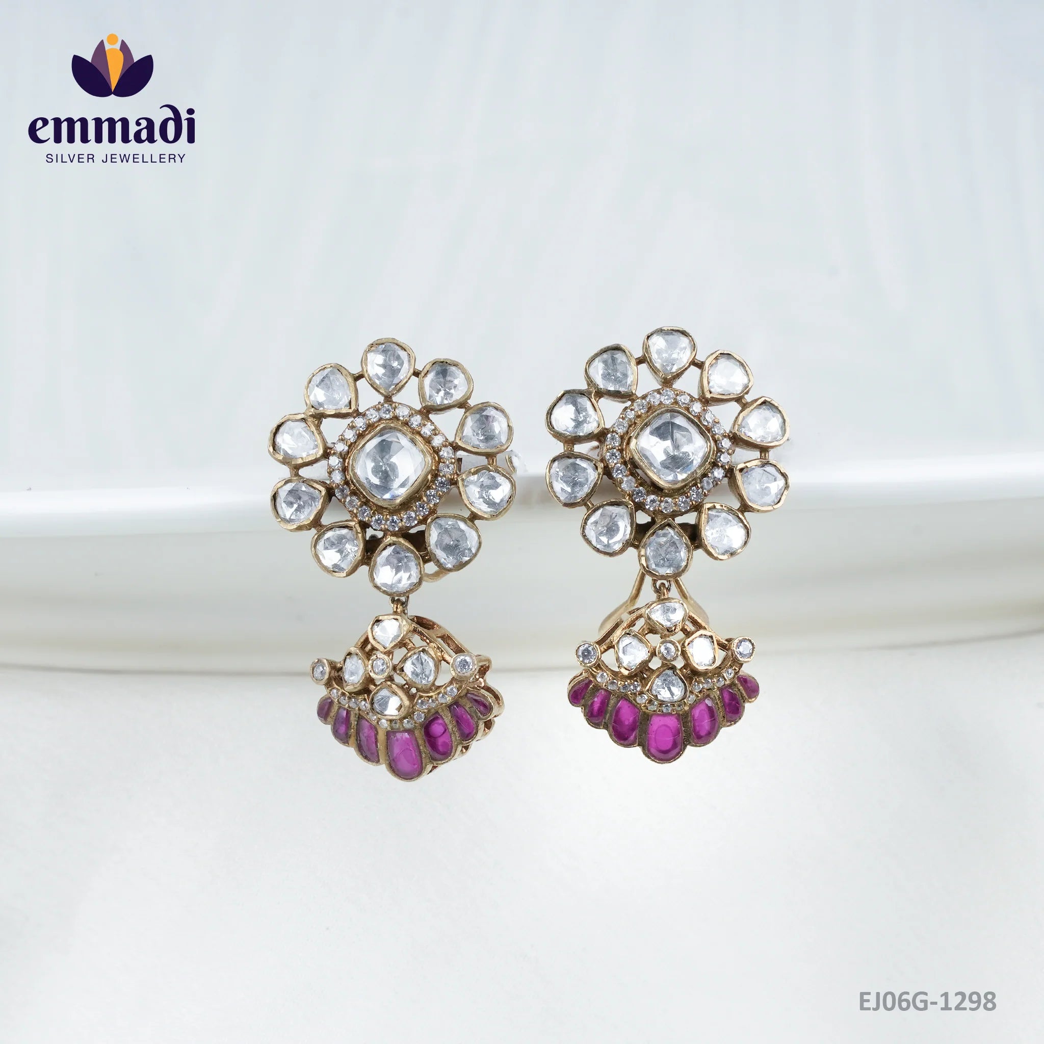 Indulge in the regal allure of Jambhala Victorian Pink Hangings, exclusively crafted by Emmadi Silver Jeweller, India's Largest silver brand. Elevate your elegance with these exquisite earrings, exuding timeless sophistication and luxury. Immerse yourself in the grandeur of Victorian aesthetics with a touch of pink, captivate hearts, and exude opulence with every step you take. Adorn yourself with grace, charm, and a touch of heritage - embrace the allure of Jambhala.