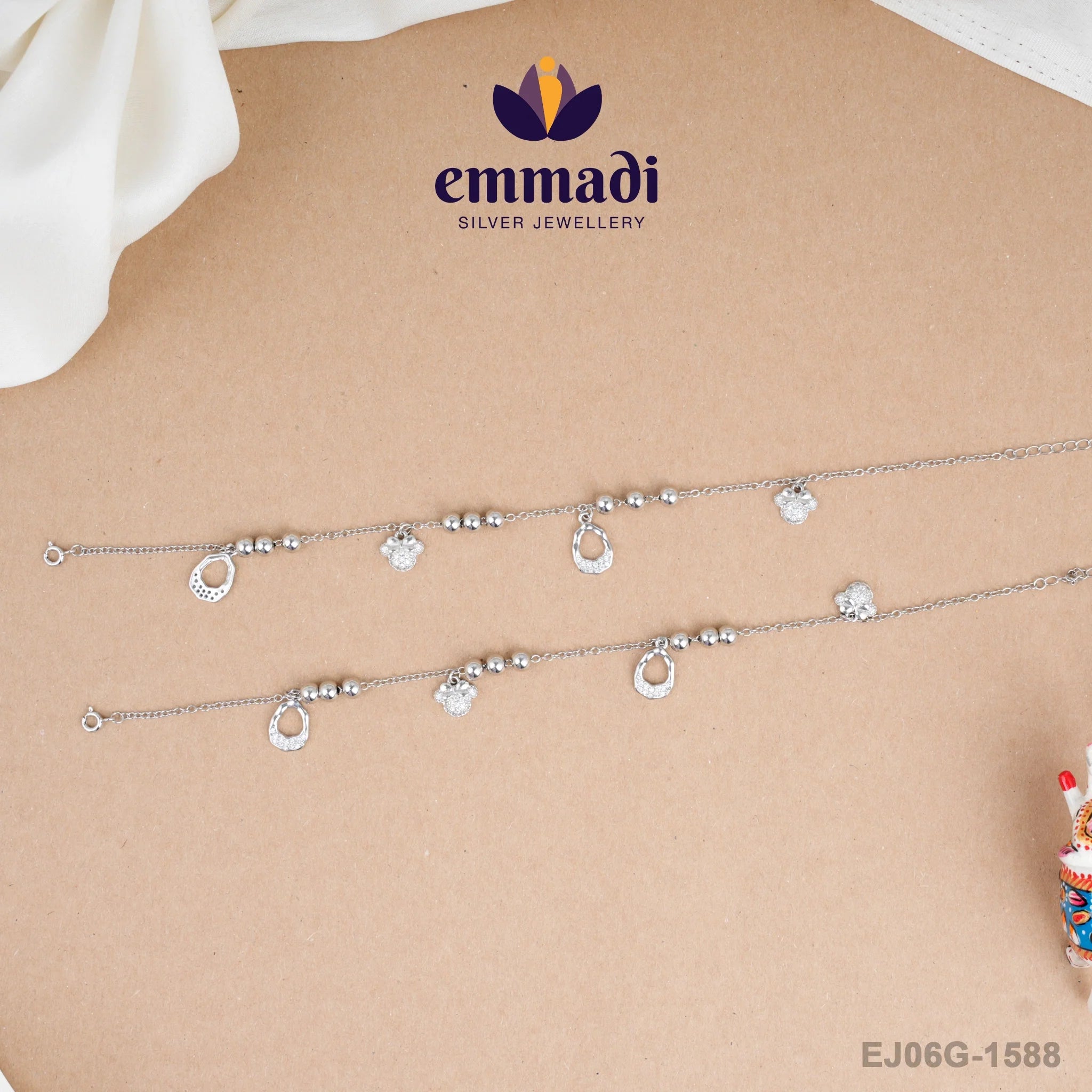Indulge in the elegance of Jivitesa Fancy White Anklets by Emmadi Silver Jeweller, India's Largest silver brand. Adorn your feet with pure sophistication and grace. Elevate your style with these exquisite anklets, exuding a charm that is simply irresistible. Emanate luxury and finesse with every step you take wearing these stunning anklets. Experience the epitome of beauty and craftsmanship; embrace the allure of Jivitesa Fancy White Anklets.