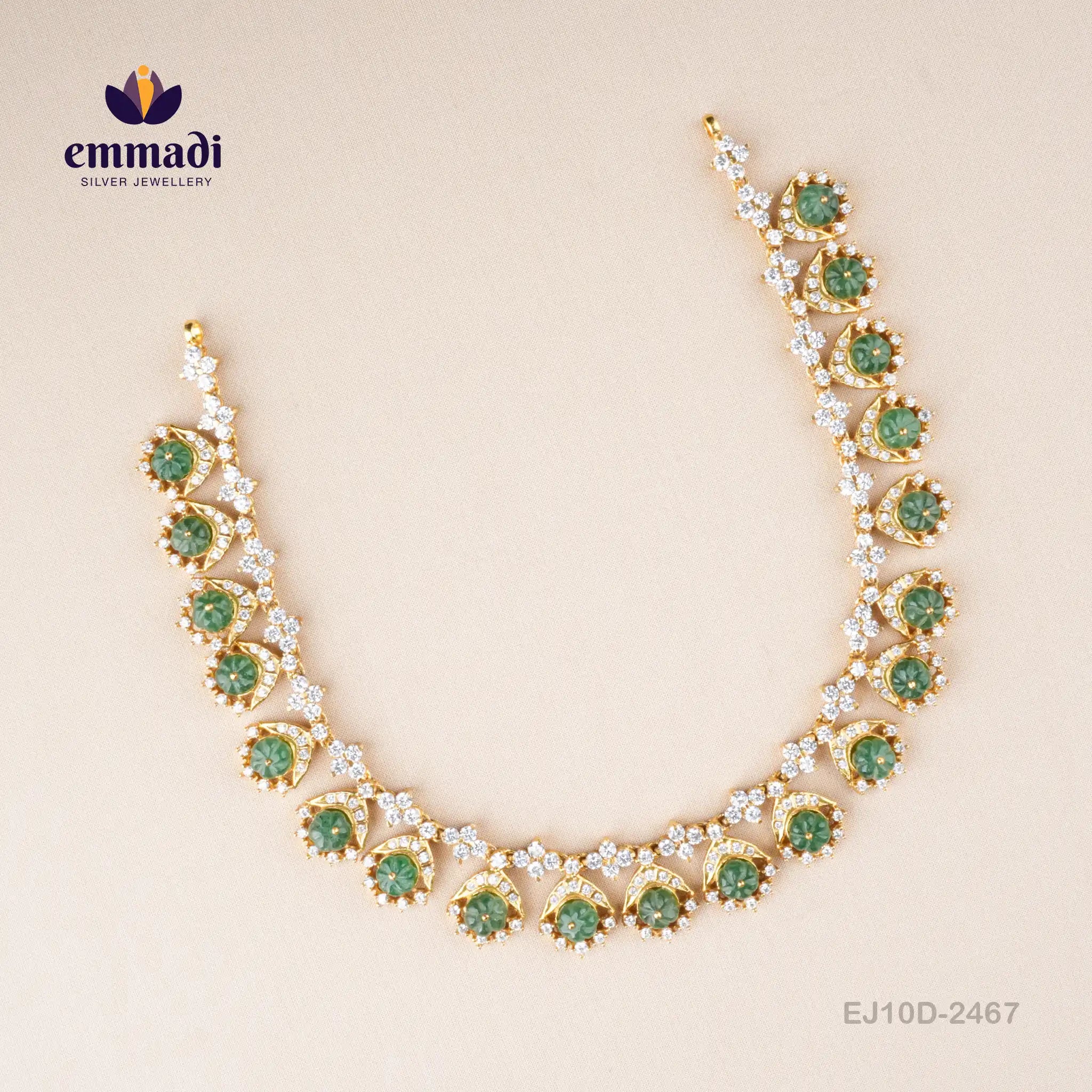 Indulge in the exquisite elegance of the Koushika Cz Green Necklace by Emmadi Silver Jeweller, India's Largest silver brand. This opulent piece is a true masterpiece, meticulously crafted with stunning green stones that radiate sophistication and charm. Elevate your look with this luxurious necklace, a symbol of beauty and grace that will captivate all who behold it. Experience the allure of timeless glamour with the Koushika Cz Green Necklace today.