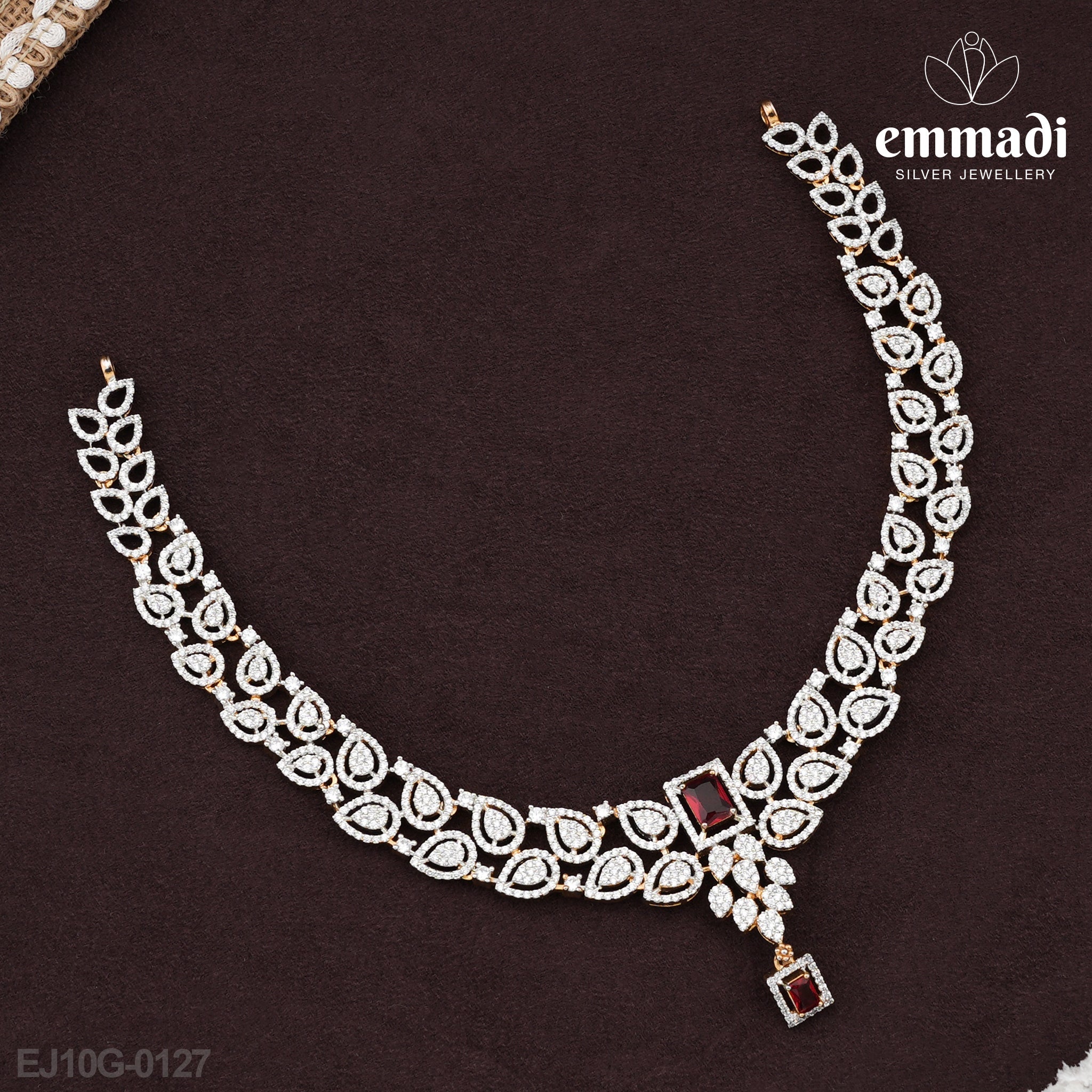 Introducing the Lalitha Elegance Premium Red CZ Necklace, a stunning piece that redefines luxury and sophistication. This exquisite necklace features resplendent cubic zirconia stones, expertly crafted to resemble the brilliance of the finest gemstones. The striking red hue of the cubic zirconia gemstones captures the essence of passion and elegance, making it an ideal accessory for any occasion.