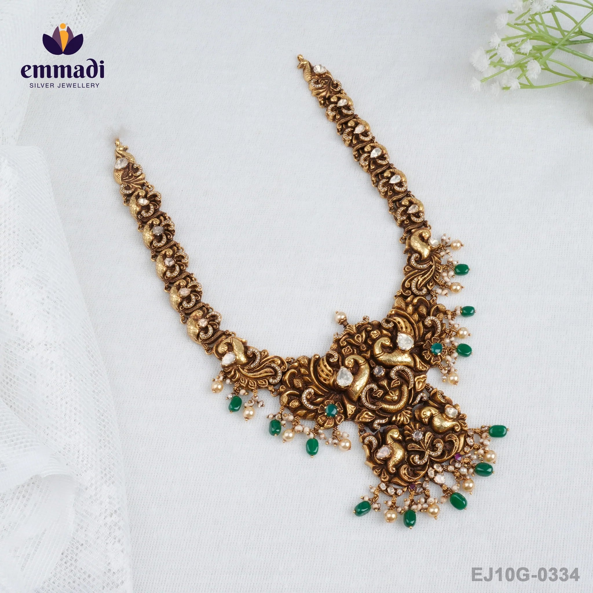 Indulge in the exquisite allure of the Parivita Nakshi Green Long Necklace by Emmadi Silver Jeweller, India's Largest silver brand. This opulent piece transcends elegance, boasting intricate craftsmanship and a captivating design that effortlessly elevates any ensemble. Embrace luxury and sophistication with this stunning accessory that exudes timeless charm and impeccable style. Make a statement and adorn yourself with the beauty of Parivita.