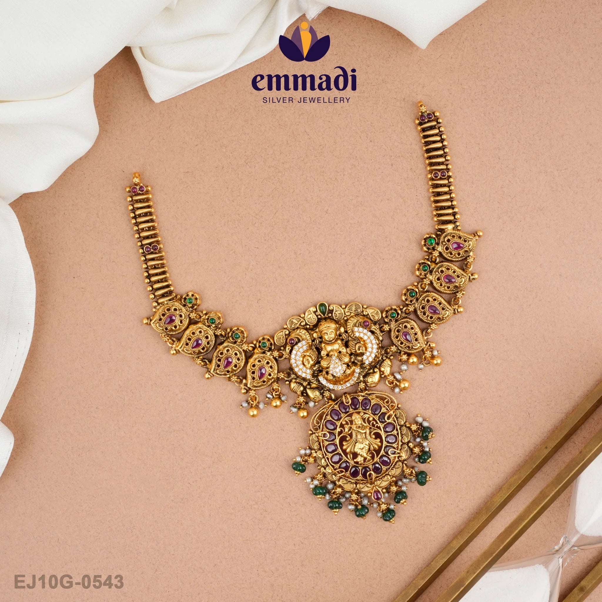Indulge in the opulence of the Rajhansa Kundan Nakshi Multi Necklace, a true masterpiece by Emmadi Silver Jeweller, India's Largest silver brand. Elevate your look with this exquisite necklace intricately crafted with shimmering Kundan stones. Embrace sophistication and elegance with every wear, making a statement of pure luxury. Immerse yourself in the allure of timeless beauty with this radiant piece that exudes unmatched glamour and grandeur. Embrace the allure of tradition and extravagance with the Rajhansa Kundan Nakshi Multi Necklace.