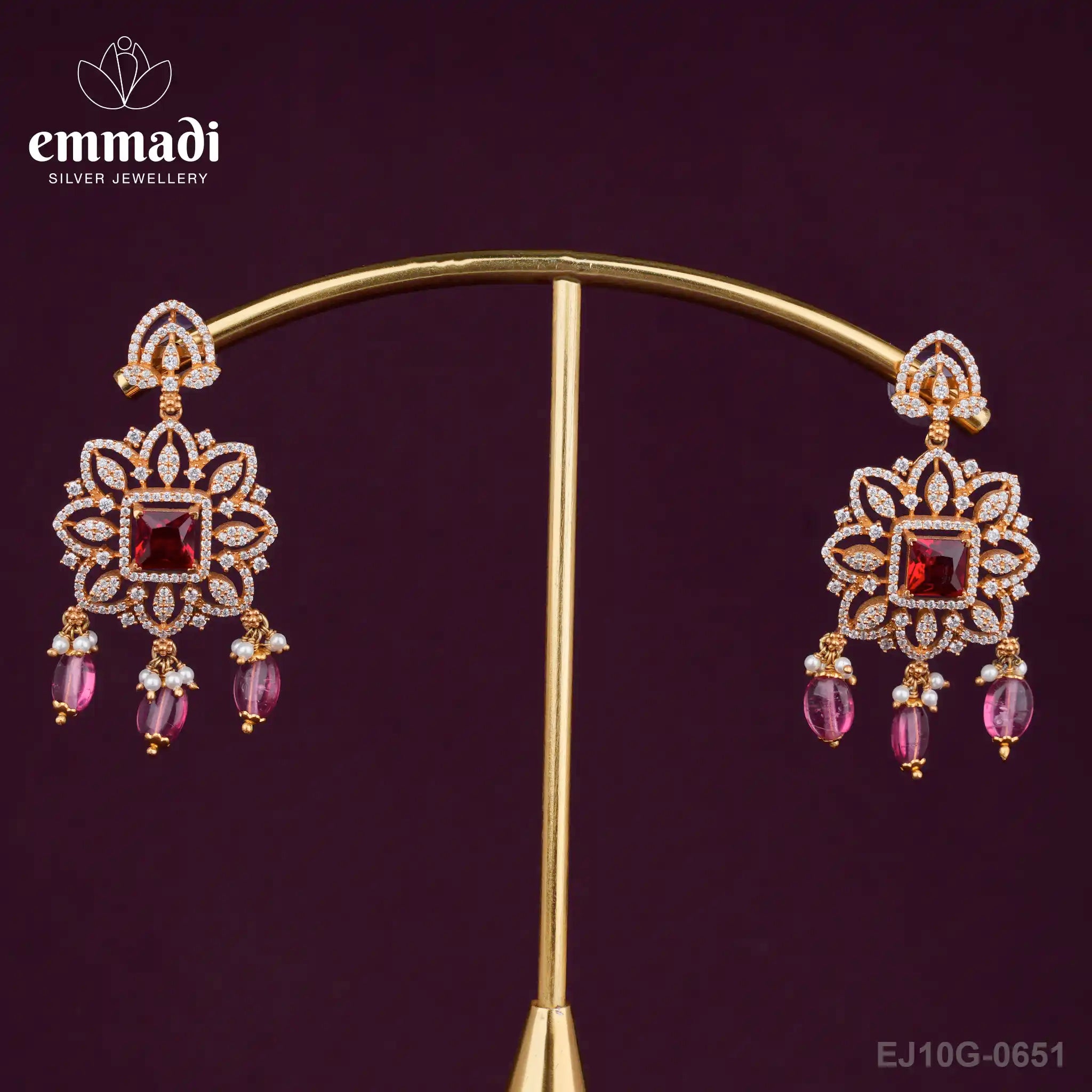 Indulge in the allure of elegance with the Samiksha CZ Red Hangings from Emmadi Silver Jeweller, India's Largest silver brand. Dripping in sophistication, these stunning earrings juxtapose fiery red CZ stones with shimmering silver for a truly luxurious aesthetic. Elevate your style with these exquisite hangings that effortlessly blend classic charm with contemporary flair. Adorn yourself with the epitome of opulence and make a statement wherever you go.