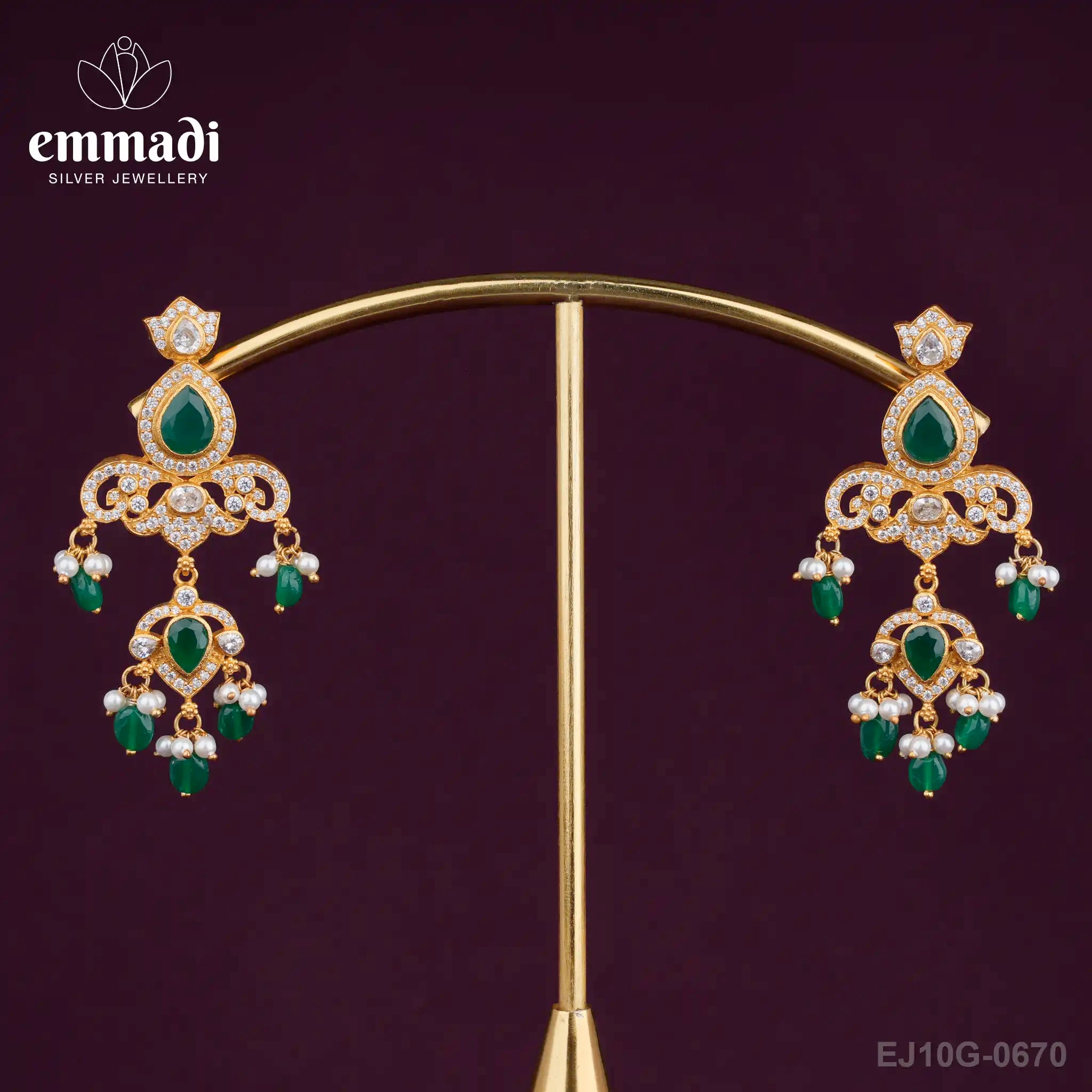 Indulge in the sophistication of Sa?satha Cz Green Hangings by Emmadi Silver Jeweller, India's Largest silver brand. Elevate your style with these exquisite earrings, crafted to perfection with sparkling green CZ stones. Make a statement with elegance.