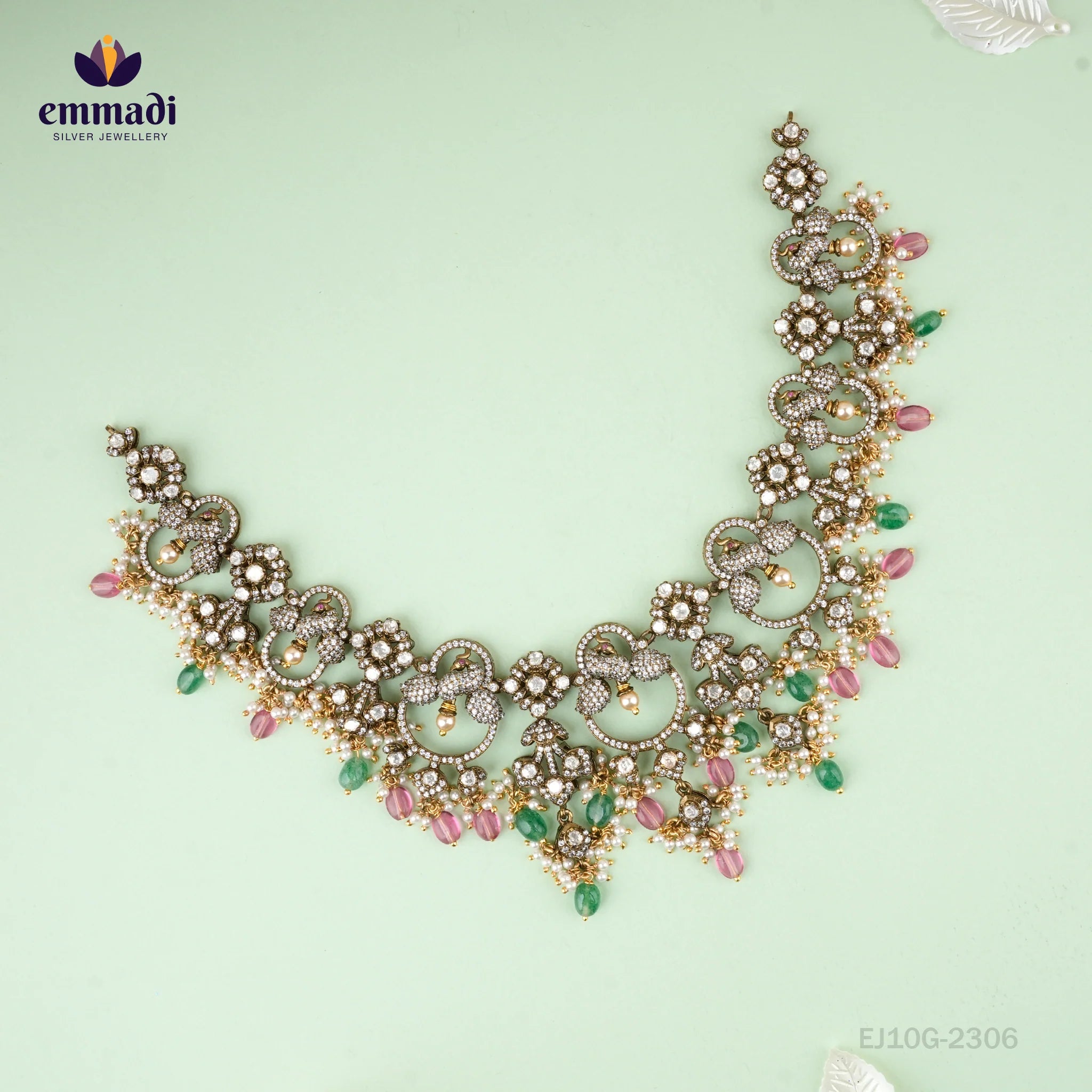 Indulge in unparalleled elegance with the Shefalika Victorian Pink Necklace by Emmadi Silver Jeweller. Elevate your outfit with a touch of sophistication, embracing the luxurious allure of this exquisite accessory. Exuding timeless charm and opulence, this necklace is a true statement piece that will effortlessly enhance your unique style. Immerse yourself in the enchanting world of Emmadi Silver Jeweller, India's Largest silver brand, and adorn yourself with the beauty of the Shefalika Victorian Pink Necklace.