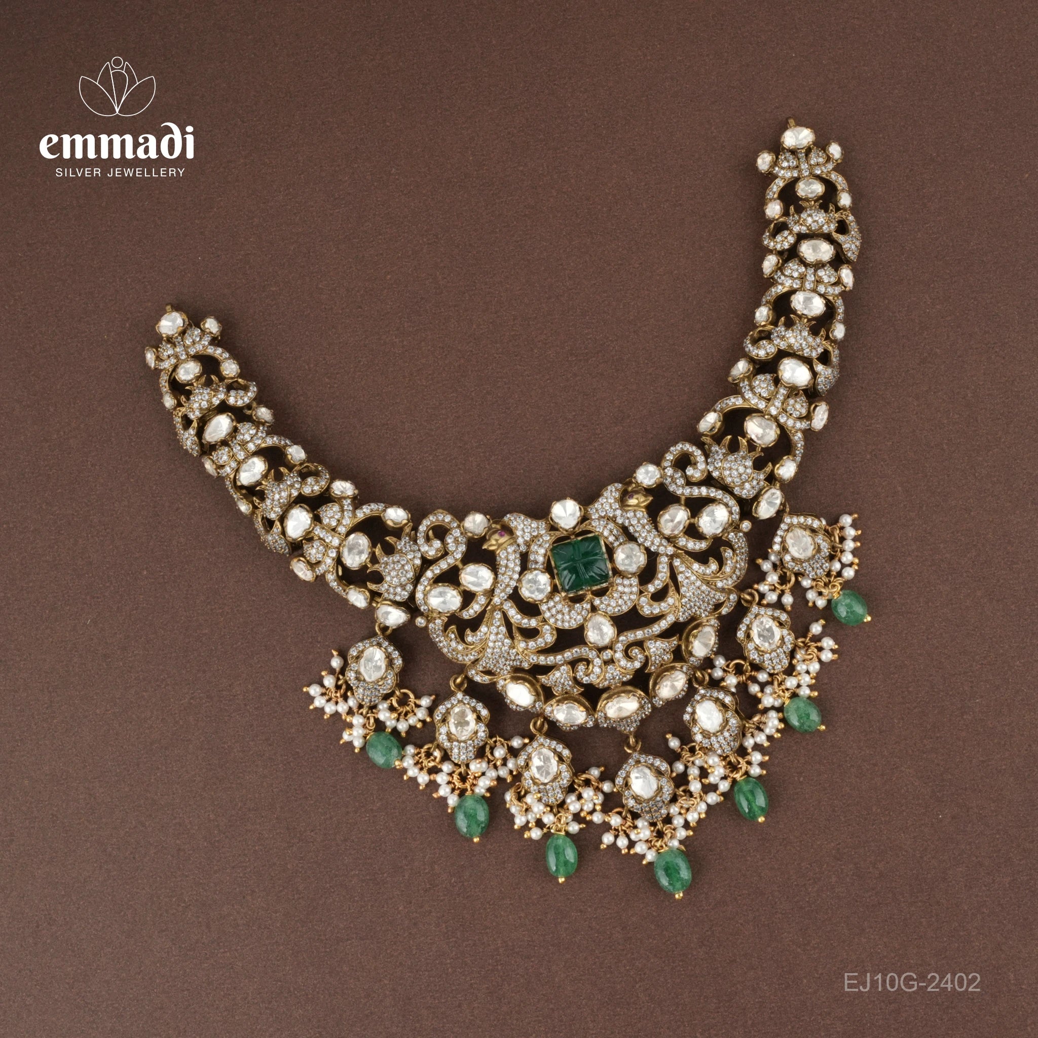 Indulge in the opulence of the Vasudhara Victorian Green Necklace, a masterpiece by Emmadi Silver Jeweller, India's Largest silver brand. This exquisite piece exudes timeless elegance and sophistication, making it the perfect accessory for those who appreciate the finer things in life. Elevate your style to a new level of luxury with this breathtaking necklace, crafted with precision and adorned with a captivating green stone that is sure to turn heads. Drape yourself in luxury and let your inner royalty shine with the Vasudhara Victorian Green Necklace.