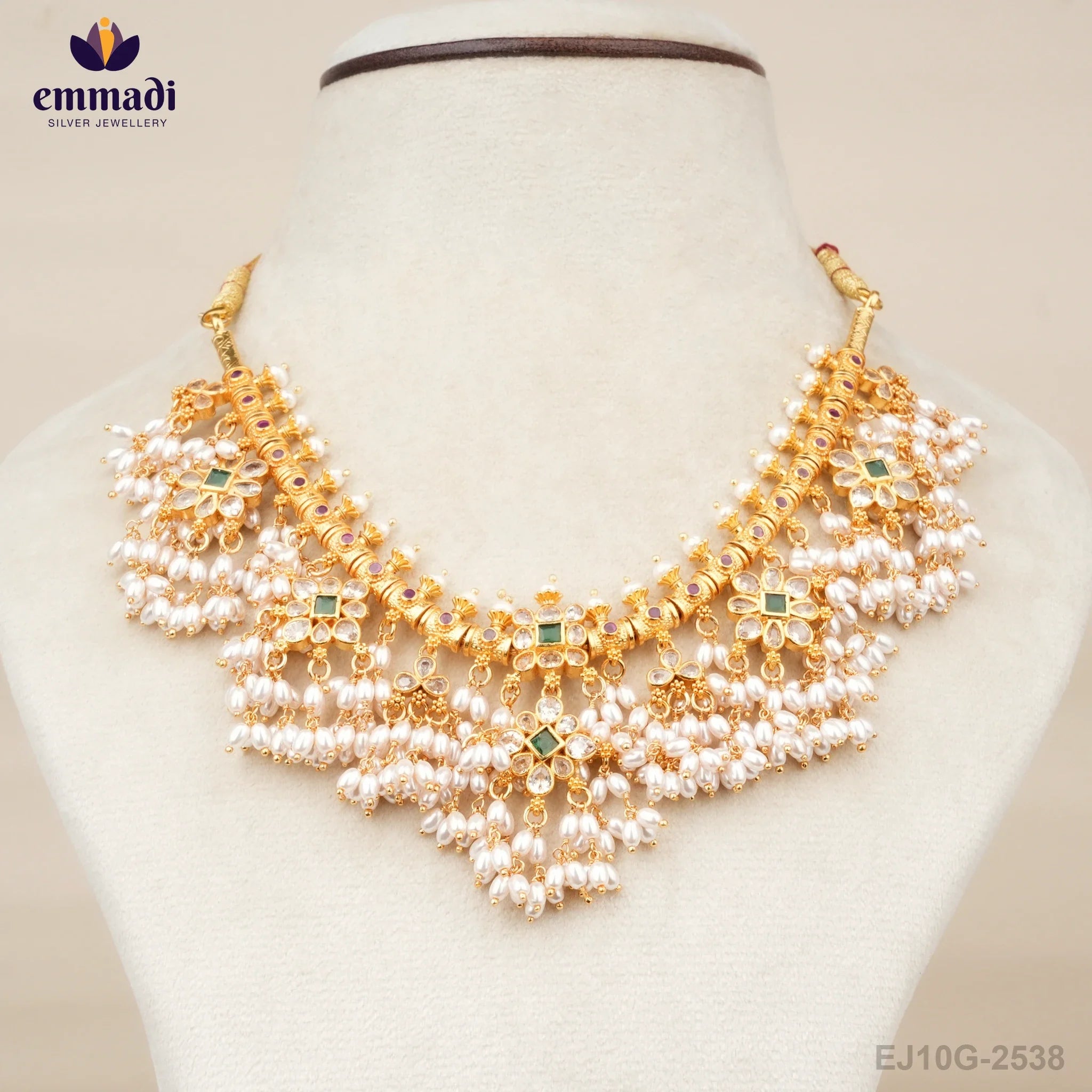 Indulge in the opulent beauty of the Chandodeva Guttapusalu Multi Necklace, a breathtaking masterpiece from Emmadi Silver Jeweller, India's Largest silver brand. Elevate your style with this exquisite necklace that exudes timeless elegance and sophistication. Drape yourself in luxury with this captivating piece that effortlessly combines traditional charm with modern flair. Make a statement and shine bright wherever you go with this stunning Chandodeva Guttapusalu Multi Necklace.