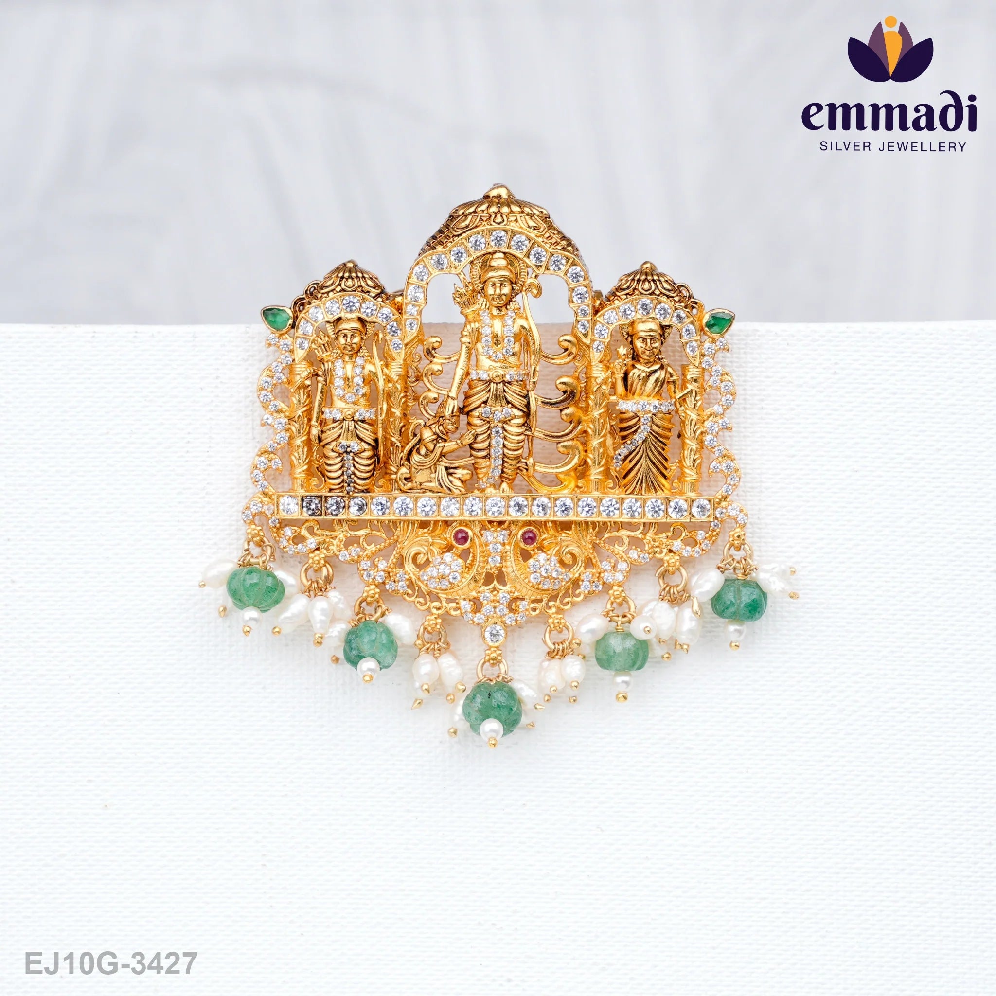 Indulge in the opulence of the Samutkarsa Ramparivar Green Pendant by Emmadi Silver Jeweller, India's Largest silver brand. Crafted with exquisite detail, this pendant exudes elegance and sophistication. Elevate your look with the mesmerising green hue that sparkles with every movement, adding a touch of glamour to any outfit. Embrace luxury and style with this stunning piece that will surely make a statement wherever you go.