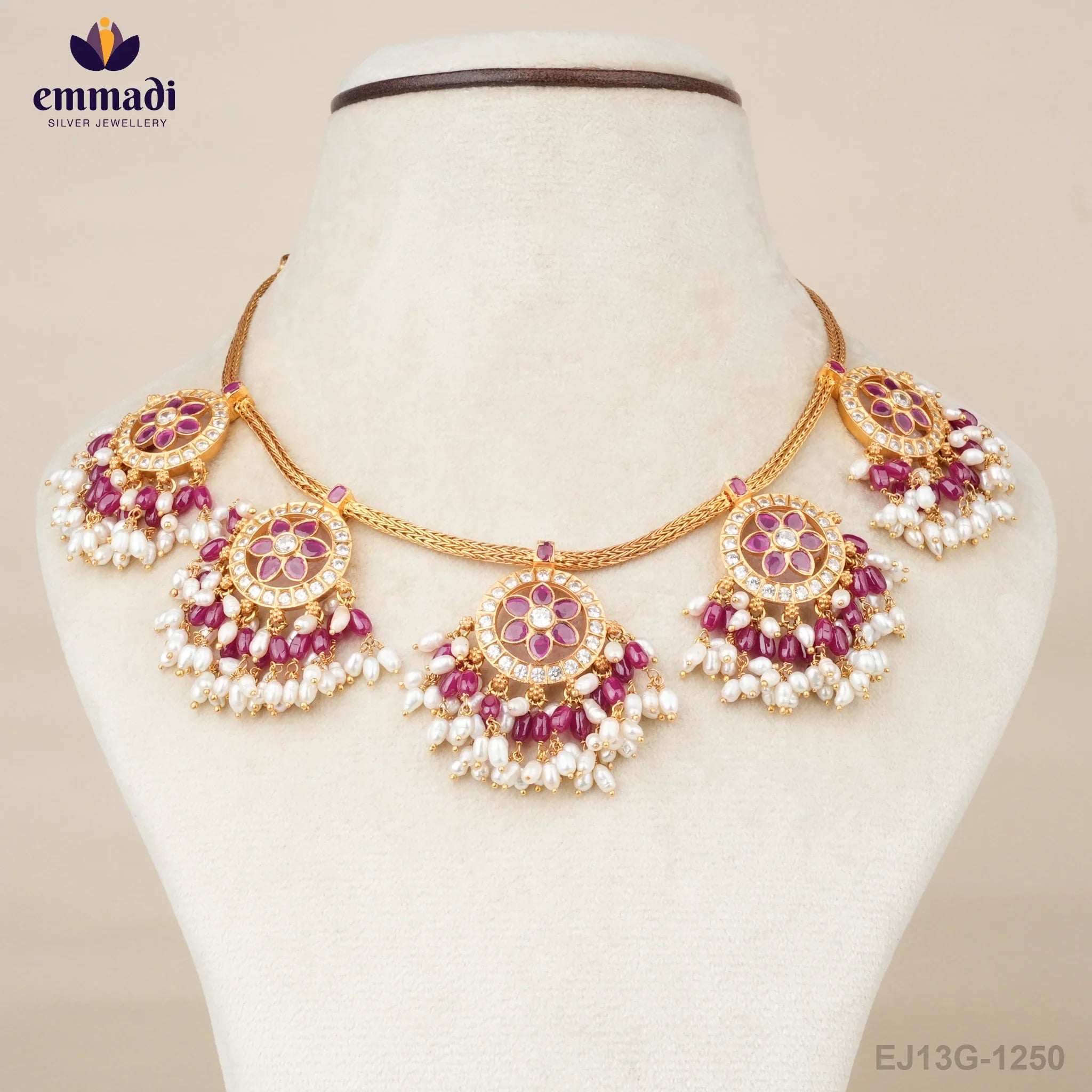 Indulge in opulence with the Kasi Guttapusalu Pink Necklace by Emmadi Silver Jeweller, India's Largest silver brand. This exquisite piece exudes elegance, featuring intricate detailing and captivating pink hues that are sure to elevate any ensemble to a new level of sophistication. Elevate your look with this luxurious necklace that embodies timeless beauty and unparalleled craftsmanship.