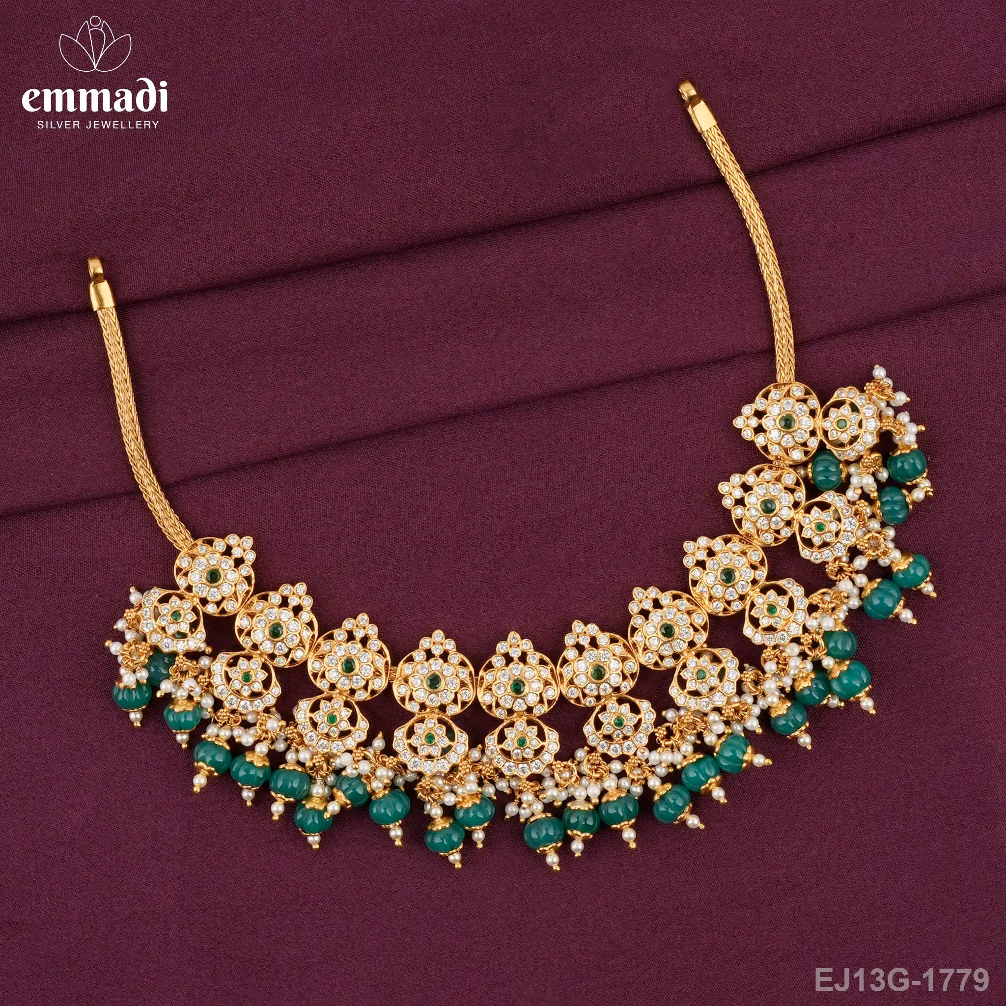 Introducing the Dh?ti Stone Green Necklace from Emmadi Silver Jeweller, India's Largest silver brand. Elevate your style with this exquisite piece that exudes elegance and sophistication. Crafted with precision and attention to detail, this necklace features a stunning green stone that radiates a sense of luxury. Add a touch of timeless beauty to your outfit with this mesmerising necklace, a true reflection of refined taste and impeccable craftsmanship. Perfect for special occasions or everyday glamour. Experience the allure of premium silver jewellery with the Dh?ti Stone Green Necklace.