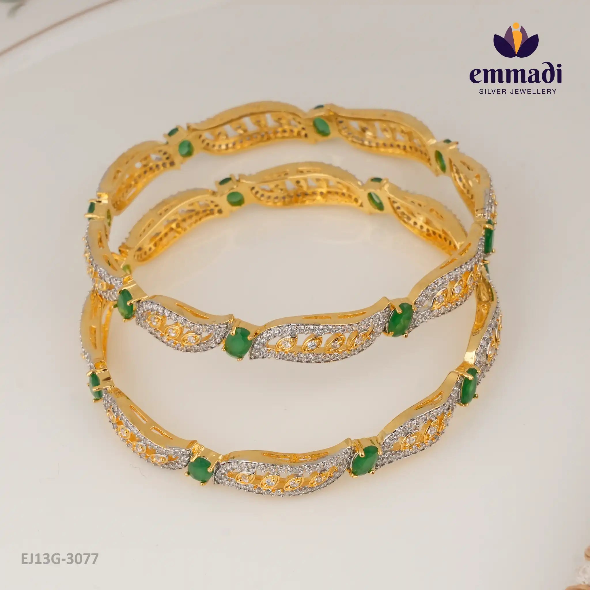 Elevate your presence with the Bhakti Premium Cz Green Bangles from the renowned Emmadi Silver Jewellery, India's Largest silver brand. Envelop your wrists in the dazzling embrace of rich green CZ stones, radiating opulence and sophistication. Make a bold statement of exquisite style as you adorn these premium bangles, commanding attention with every gesture. Let your unparalleled taste for luxury shine through as you showcase timeless elegance and enchanting sophistication.