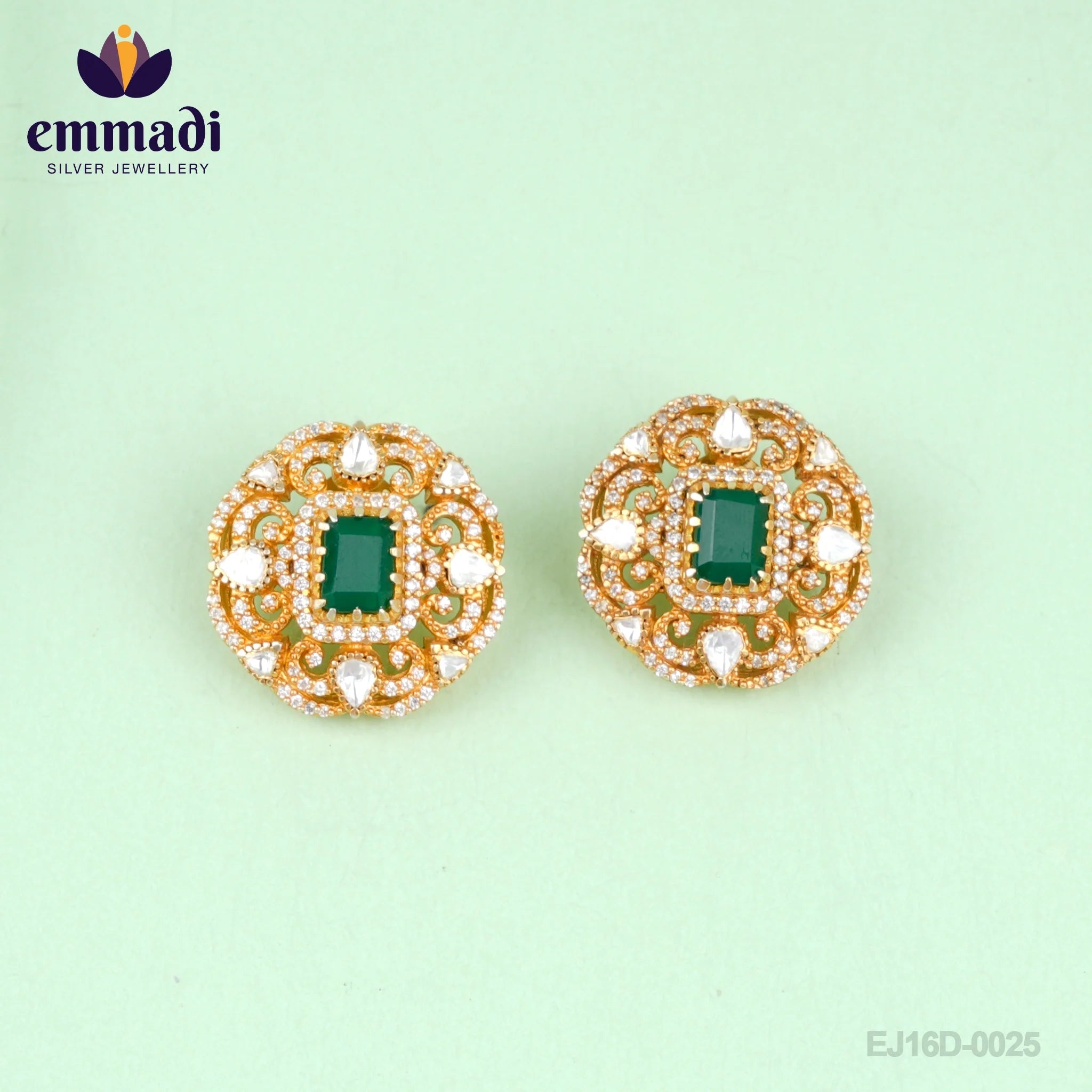 Make a statement with our Mangalam Handcrafted Ear Tops Collection and experience the timeless beauty of pure gold plating, 92.5 silver, and stunning moissanite green stones. Shop now and add a touch of elegance to your wardrobe.