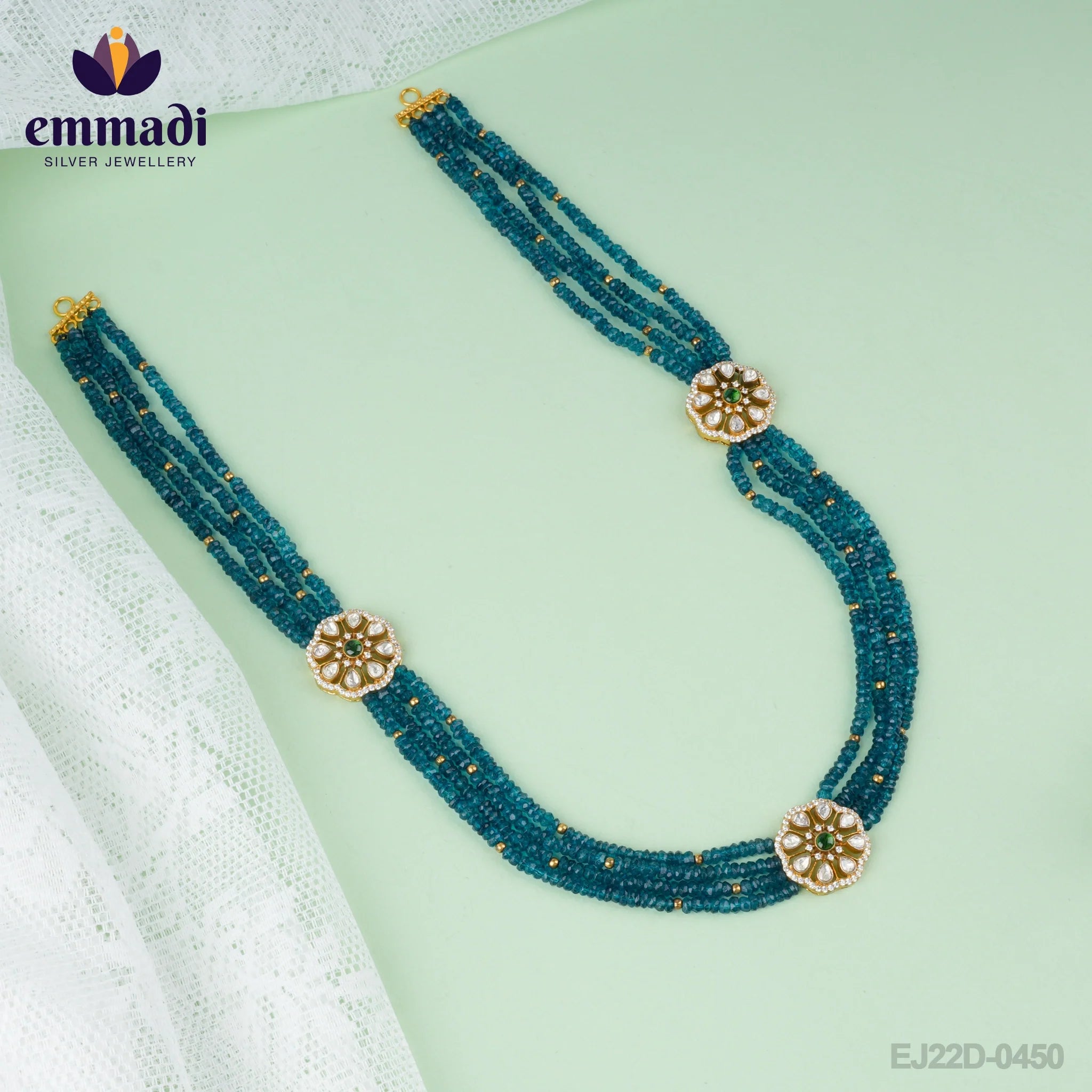 Each piece at Agni Handcrafted is meticulously handcrafted by skilled artisans from Emmadi Jewellers, ensuring that every detail is carefully considered and executed. The green moissanite stones add a touch of elegance and sophistication to the necklace, making it a timeless accessory that can elevate any outfit.