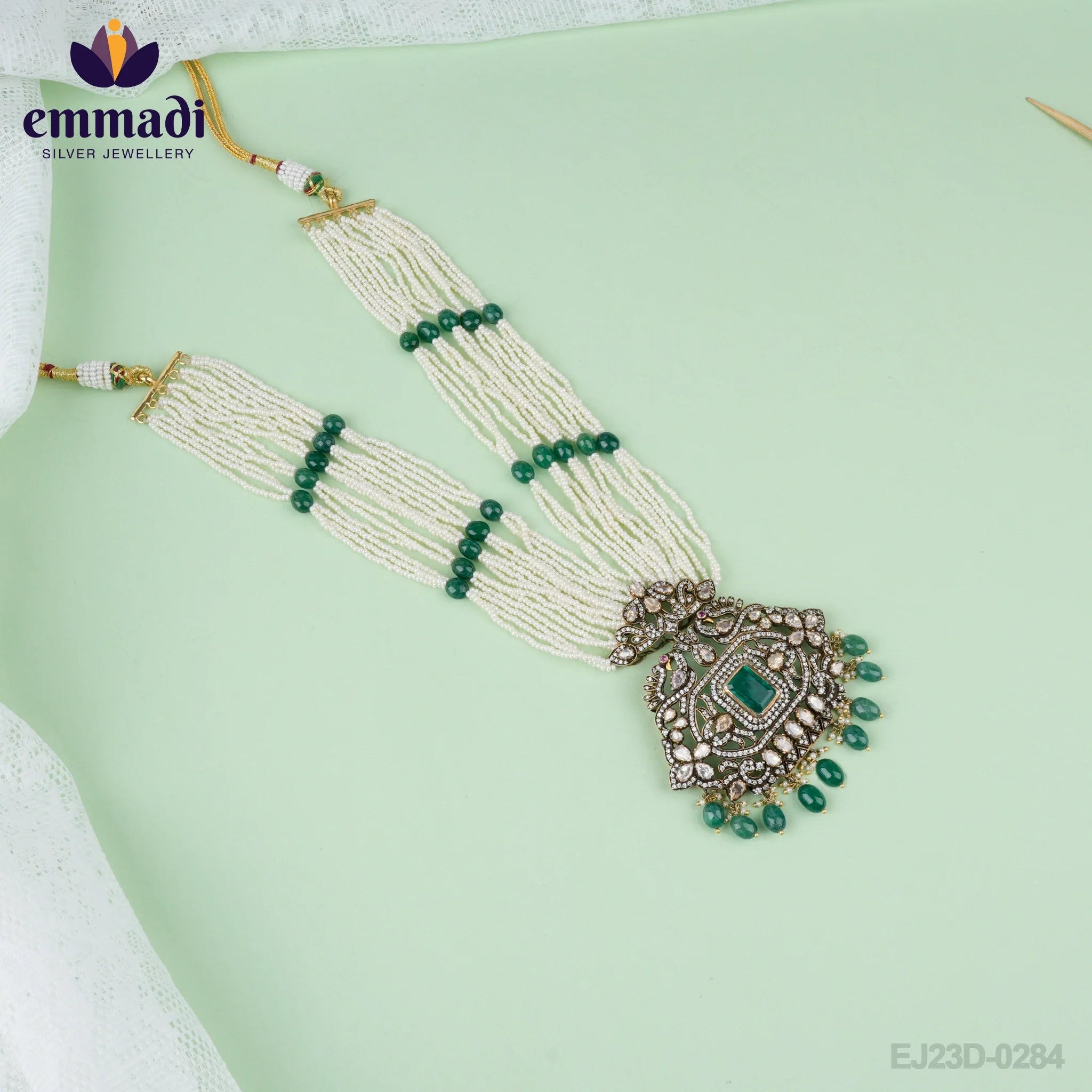 Emmadi Jewellers brings you a stunning handcrafted long necklace with pure gold plating on 92.5 silver. This exquisite piece is inspired by Victorian era designs, featuring intricate green gemstones for a touch of elegance.