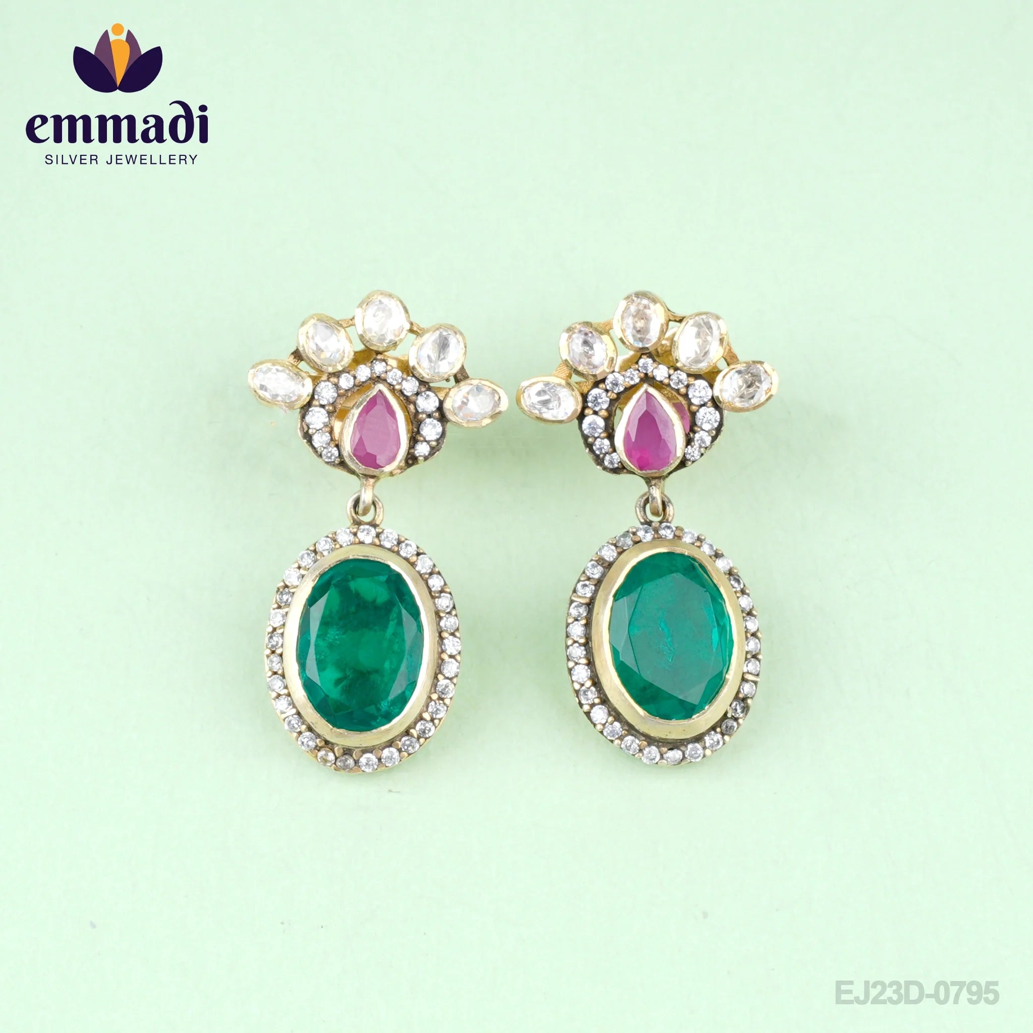 Emmadi Jewellers brings you the exquisite collection of handcrafted 92.5 silver earrings with pure gold plating - the HANGINGS VICTORIAN MULTI. These stunning earrings are carefully crafted with intricate designs and detailed workmanship to give you a touch of elegance and sophistication.