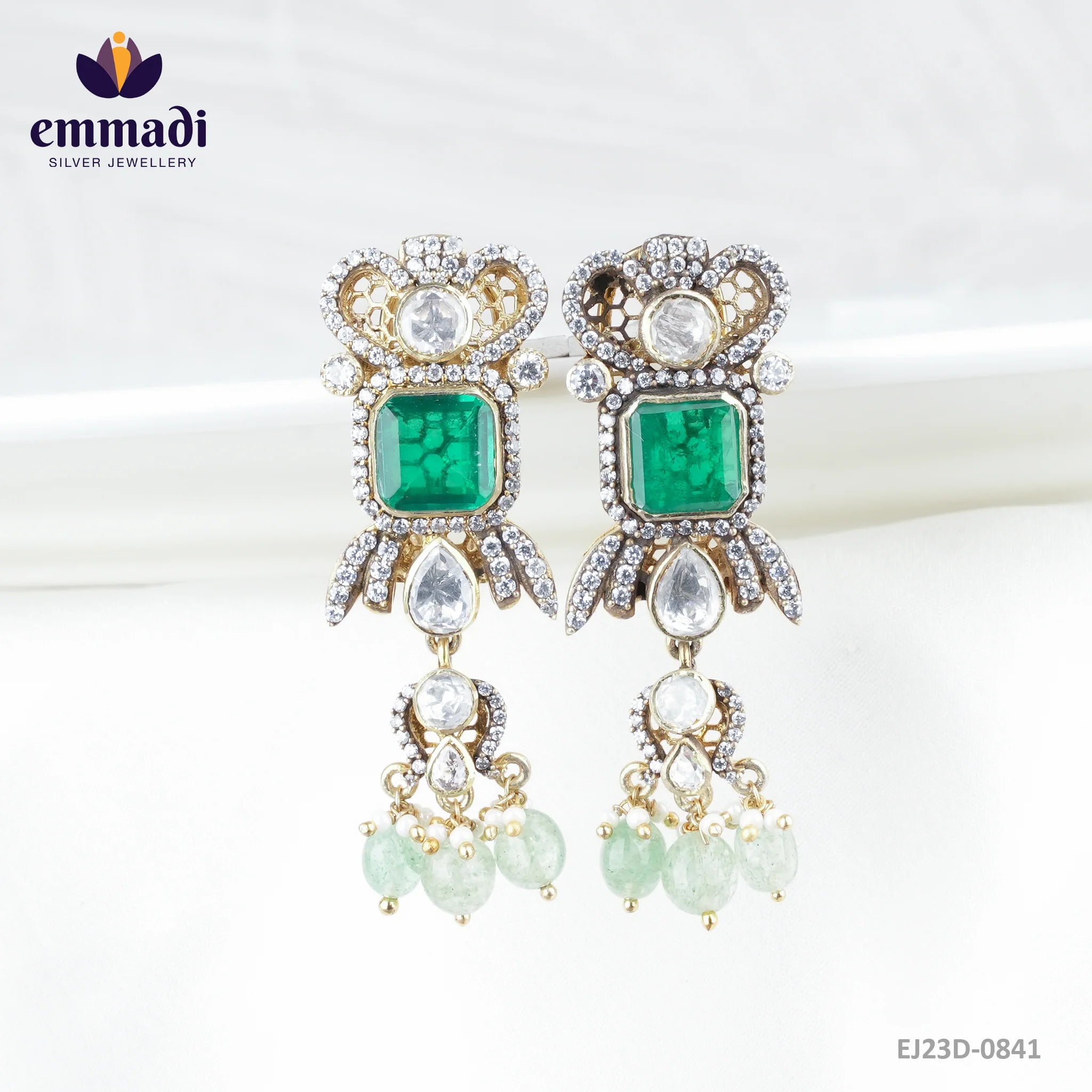 Indulge in the opulent allure of the Nivruti Victorian Green Hangings, a masterpiece by Emmadi Silver Jeweller, India's Largest silver brand. ������� Elevate your style with these exquisite earrings, adorned with intricate Victorian detailing and a captivating green hue. Let your elegance shine through effortlessly with this luxurious pair, destined to make a statement wherever you go. Embellish your look with a touch of sophistication and charm, courtesy of Nivruti.