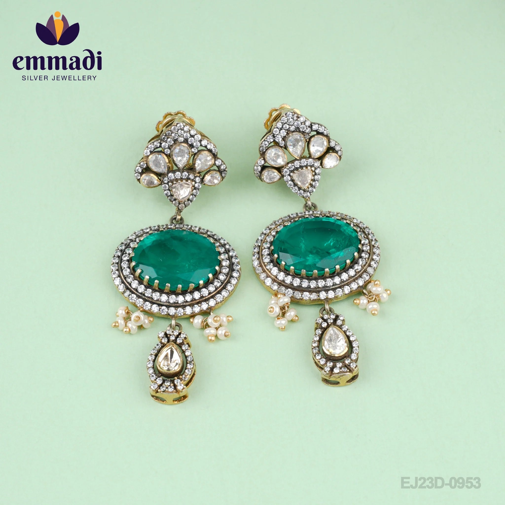 Indulge in luxury and elegance with the Hangings Victorian Green from Emmadi Jewellers. Make a statement and add a touch of glamour to your look with these exquisite handcrafted earrings.