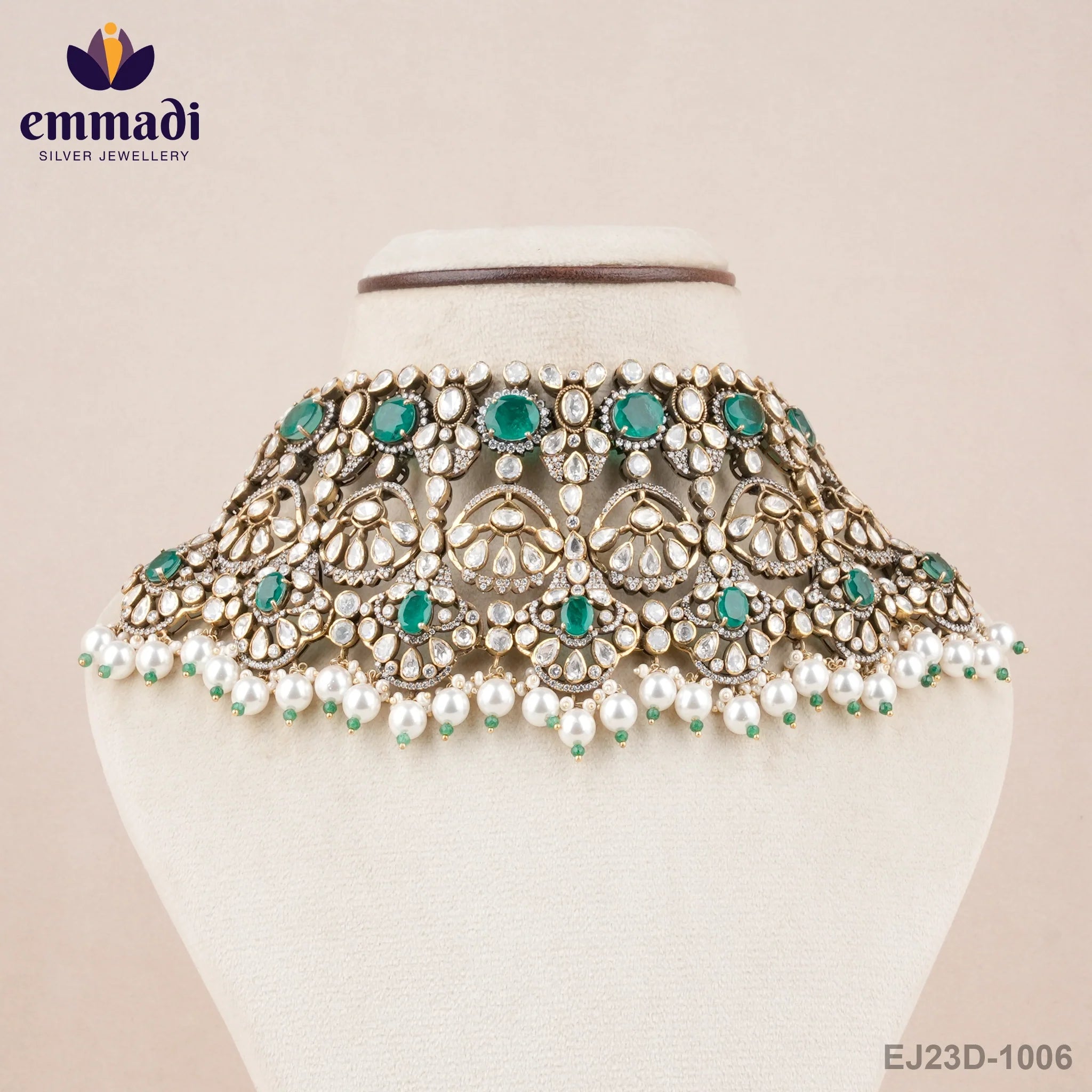 Indulge in the opulent elegance of the Parbani Victorian Green Choker - a true masterpiece crafted for those with refined taste. This exquisite choker, brought to you by India's Largest Silver Brand, Emmadi Silver Jeweller, effortlessly exudes a sense of regal sophistication. Elevate your look with this striking piece that perfectly balances tradition and modernity. Truly a statement of luxury and charm, the Parbani Victorian Green Choker is a timeless treasure that will leave a lasting impression wherever you go.