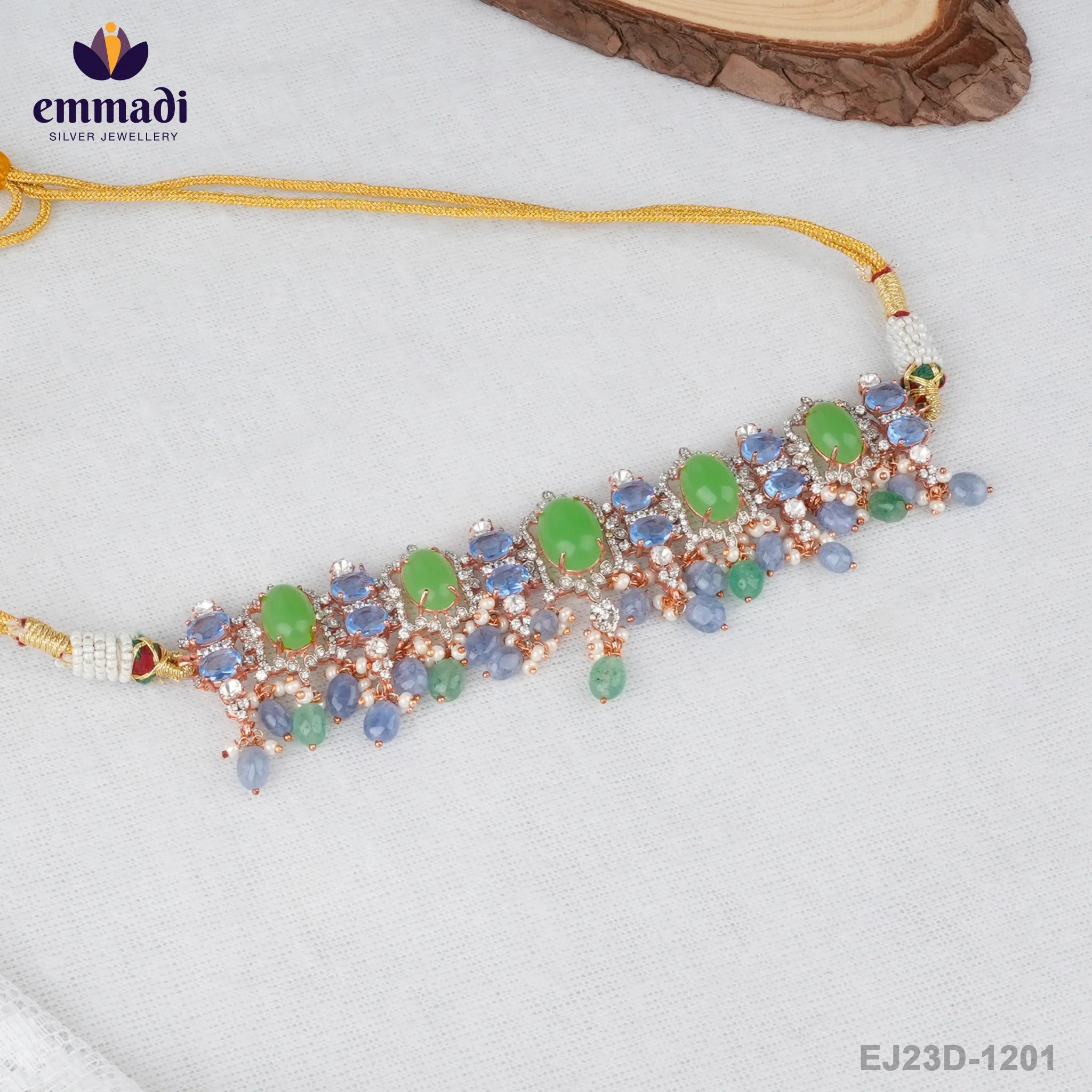 This choker features two striking color stones, adding a pop of color and vibrancy to any outfit. The intricate design and craftsmanship of this piece make it a versatile accessory that can be worn for special occasions or everyday wear.