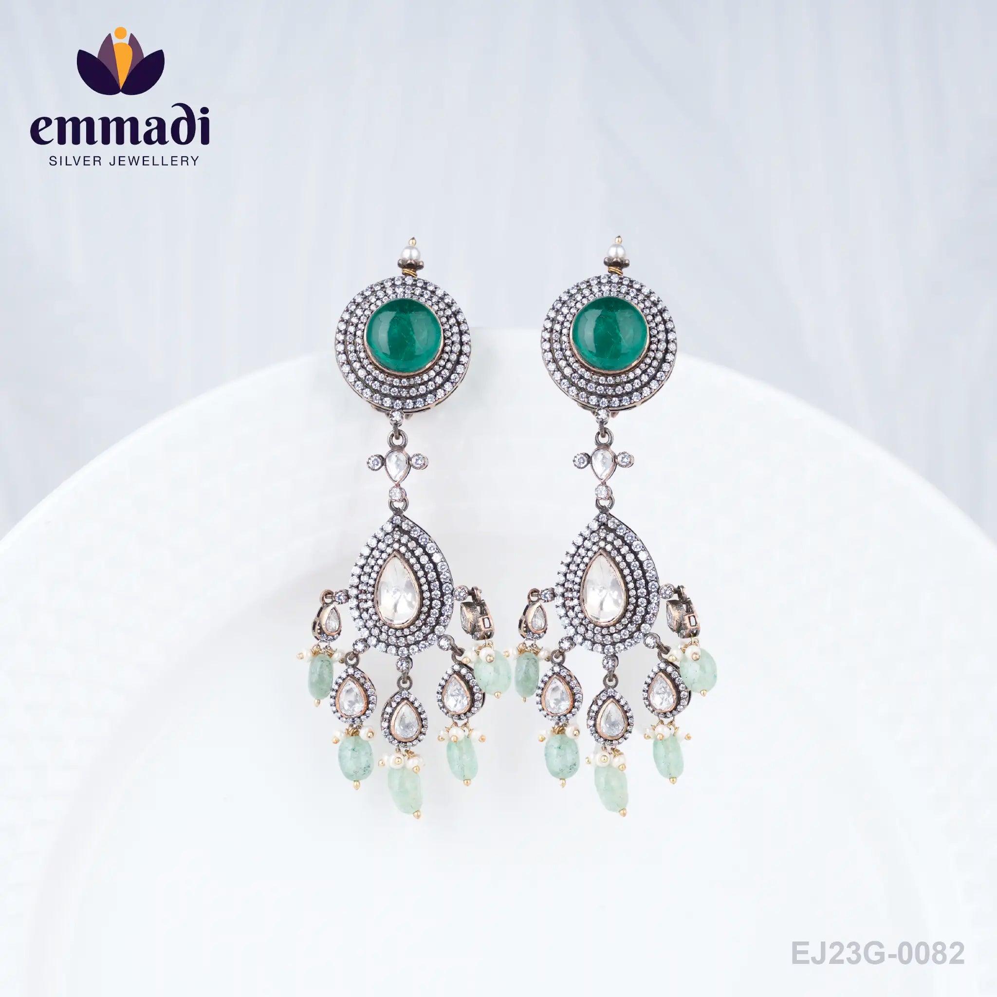 Indulge in opulence with the Saakshi Victorian Green Hangings by Emmadi Silver Jeweller, India's Largest silver brand. Adorn yourself in elegance and grace with these exquisite green hangings that exude Victorian charm and sophistication. Elevate your style to new heights with a touch of luxury that is sure to turn heads and leave a lasting impression. Experience the allure of timeless beauty with these captivating earrings that are perfect for any special occasion.