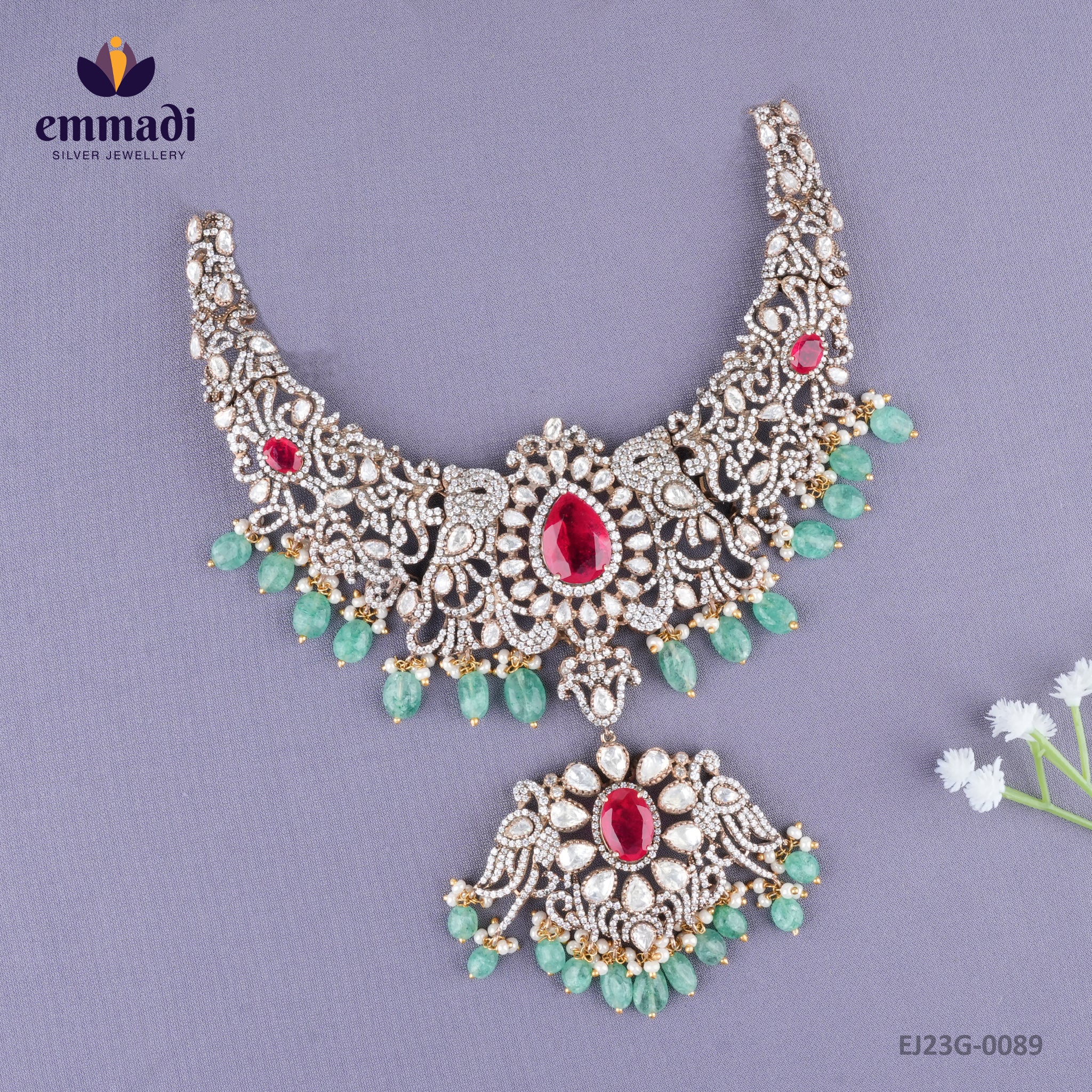 Indulge in the timeless beauty of the Salmali Victorian Pink Necklace, a true reflection of elegance and grace. Crafted by Emmadi Silver Jeweller, India's Largest silver brand, this exquisite piece exudes sophistication and luxury. Elevate your look with the shimmering pink hues and intricate Victorian design of this stunning necklace. Make a statement and allure with every wear, radiating opulence and prestige effortlessly. A must-have addition to your jewellery collection for those special occasions when only the finest will suffice.