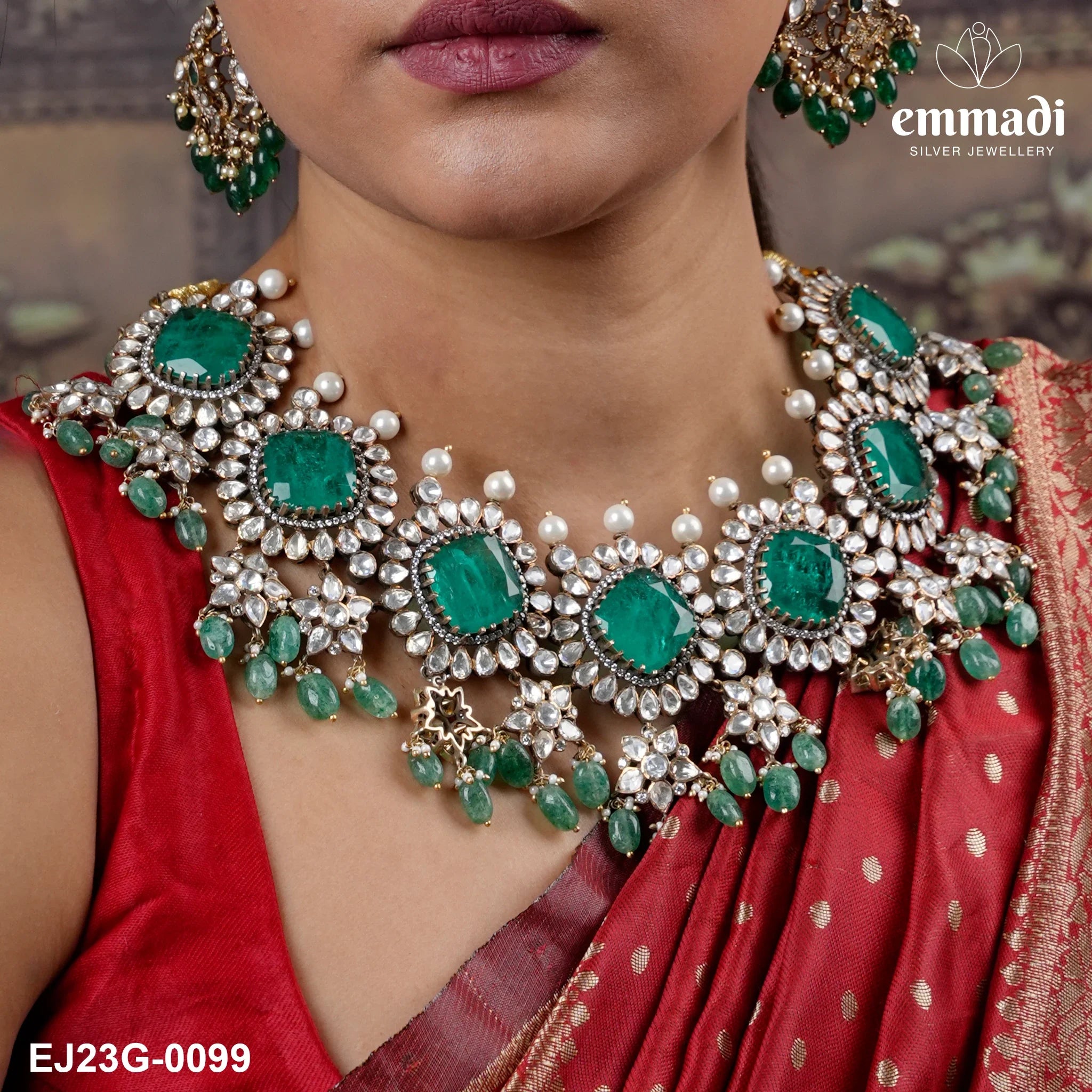 Indulge in the opulent charm of the Sambhwi Victorian Green Necklace, a masterpiece from Emmadi Silver Jeweller, India's Largest silver brand. ���� Elevate your style with this exquisite piece that exudes elegance and sophistication. Adorn yourself with the allure of Victorian design, beautifully intertwined with a mesmerising green gemstone that captures the essence of luxury. Enhance your look with this breathtaking necklace that embodies timeless grace and unmatched beauty. Elevate every outfit to extraordinary with this stunning accessory.