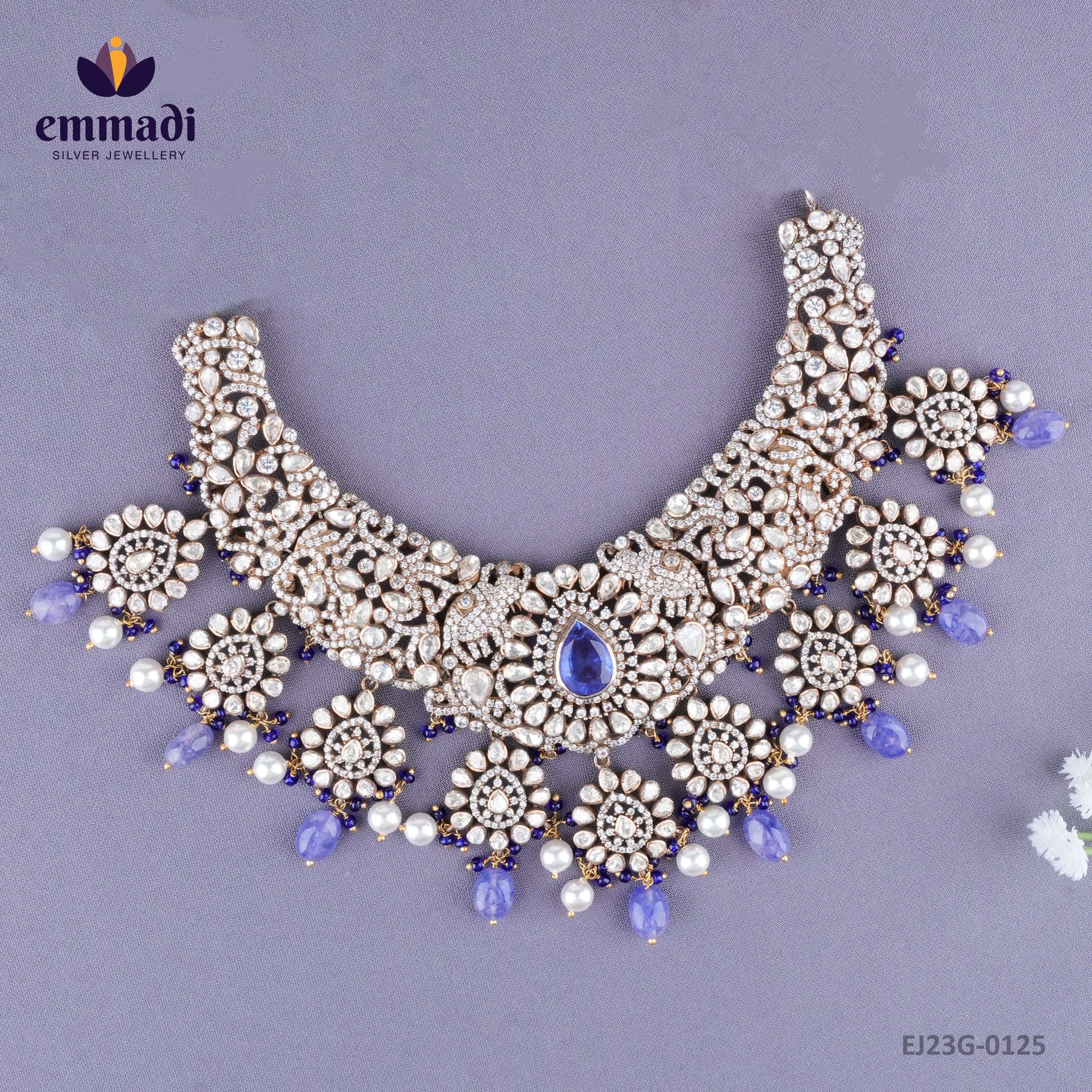 Indulge in the exquisite elegance of the Sarkari Victorian Blue Necklace, a true masterpiece from Emmadi Silver Jeweller, India's Largest silver brand. Elevate your look with this enchanting necklace that exudes sophistication and charm. The intricate design and stunning blue gemstone will add a touch of luxury and refinement to any outfit. Make a statement and embrace timeless beauty with this exceptional piece that is bound to turn heads wherever you go. Experience the epitome of class and style with the Sarkari Victorian Blue Necklace.