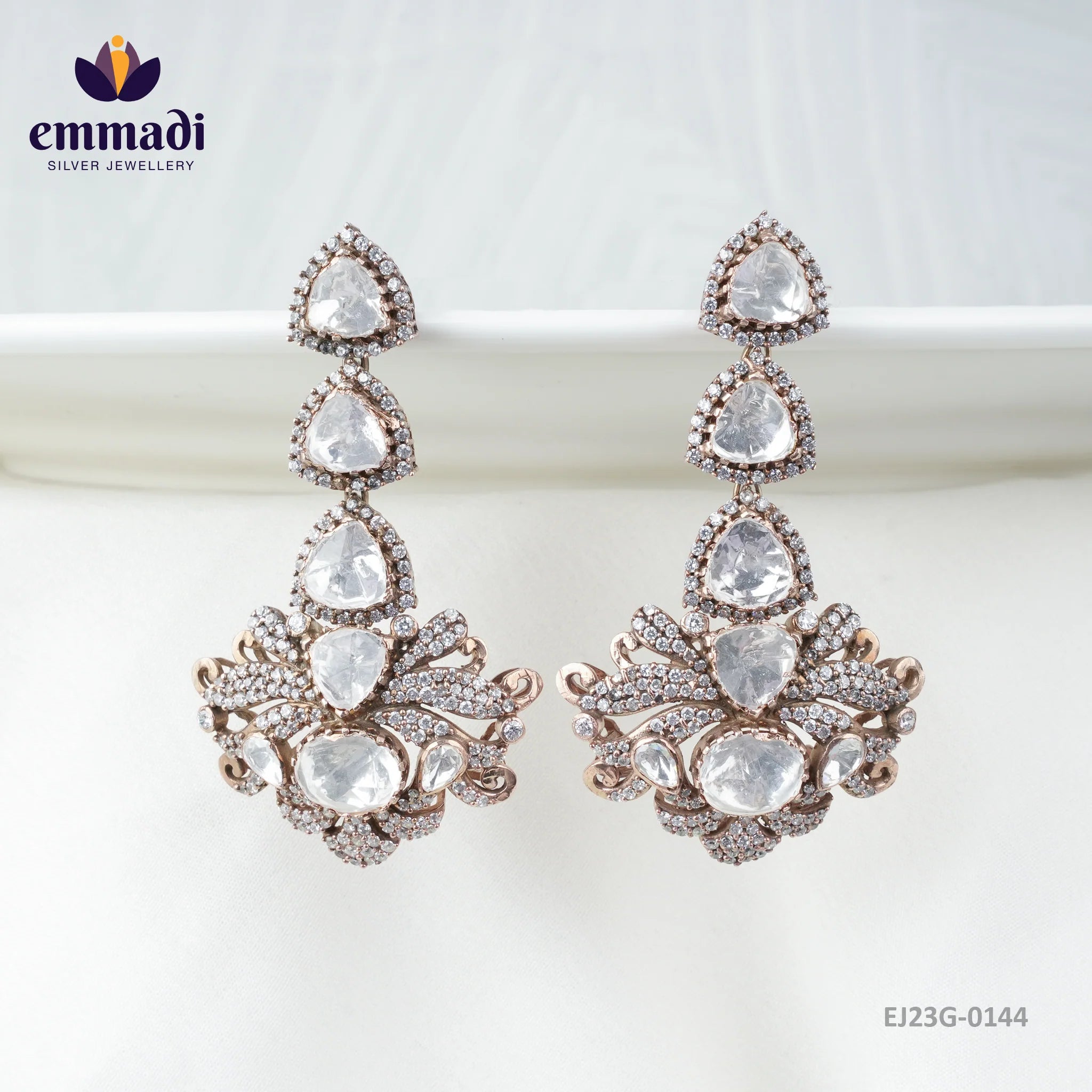 Indulge in the timeless elegance of the Shejali Victorian White Hangings. Crafted with exquisite detail, these earrings exude a sense of opulence and sophistication that is truly unmatched. Elevate your look with a touch of graceful femininity, perfect for any occasion. Complete your ensemble with a piece from Emmadi Silver Jeweller, India's Largest silver brand, and embrace the allure of luxury.