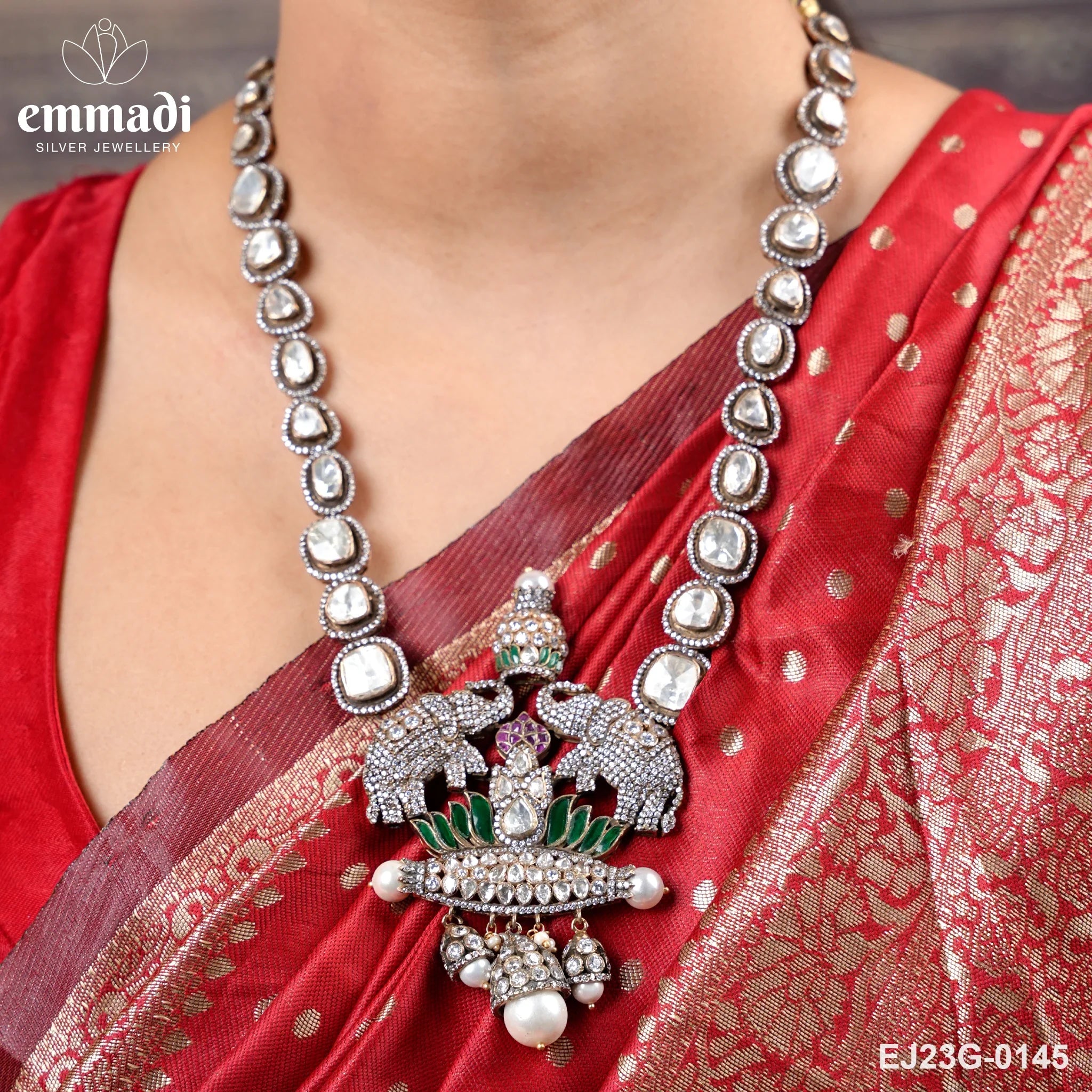 Indulge in opulence with the Shibani Victorian Multi Long Necklace, a stunning masterpiece from Emmadi Silver Jeweller, India's Largest silver brand. Elevate your ensemble with this exquisitely crafted piece, boasting intricate details and a timeless design. Radiate luxury and sophistication with every wear, making a statement that echoes elegance and charm. Adorn yourself with the finest, embrace the regal allure of the Shibani Victorian Multi Long Necklace.
