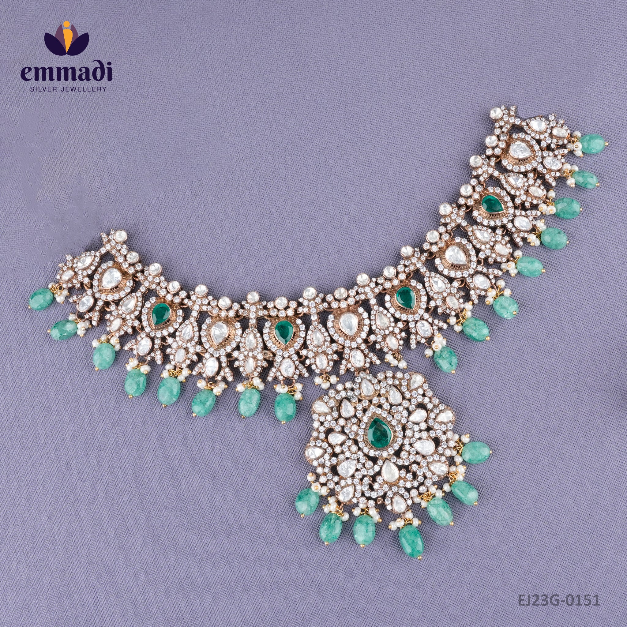 Indulge in the enchanting elegance of the Shivani Victorian Green Necklace by Emmadi Silver Jeweller, India's Largest silver brand. This exquisite piece exudes sophistication and charm, adding a touch of opulence to any outfit. Elevate your style with this luxurious necklace crafted to perfection, a true statement of timeless beauty.