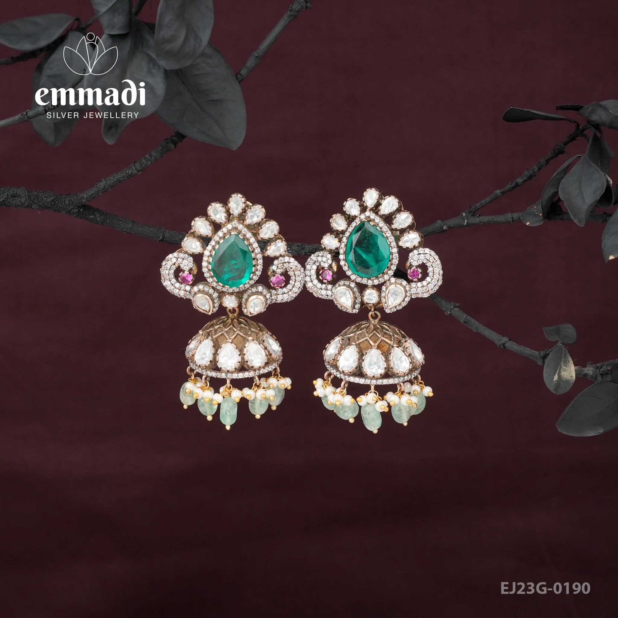 Indulge in the opulent elegance of the Takshvi Victorian Multi Buttalu by Emmadi Silver Jeweller, India's Largest silver brand. Elevate your ensemble with these exquisite earrings that exude Victorian charm and timeless sophistication. Adorn yourself with the intricate beauty of multiple buttalu design, crafted to mesmerise and captivate. Make a statement that whispers luxury and grace with every sway.
