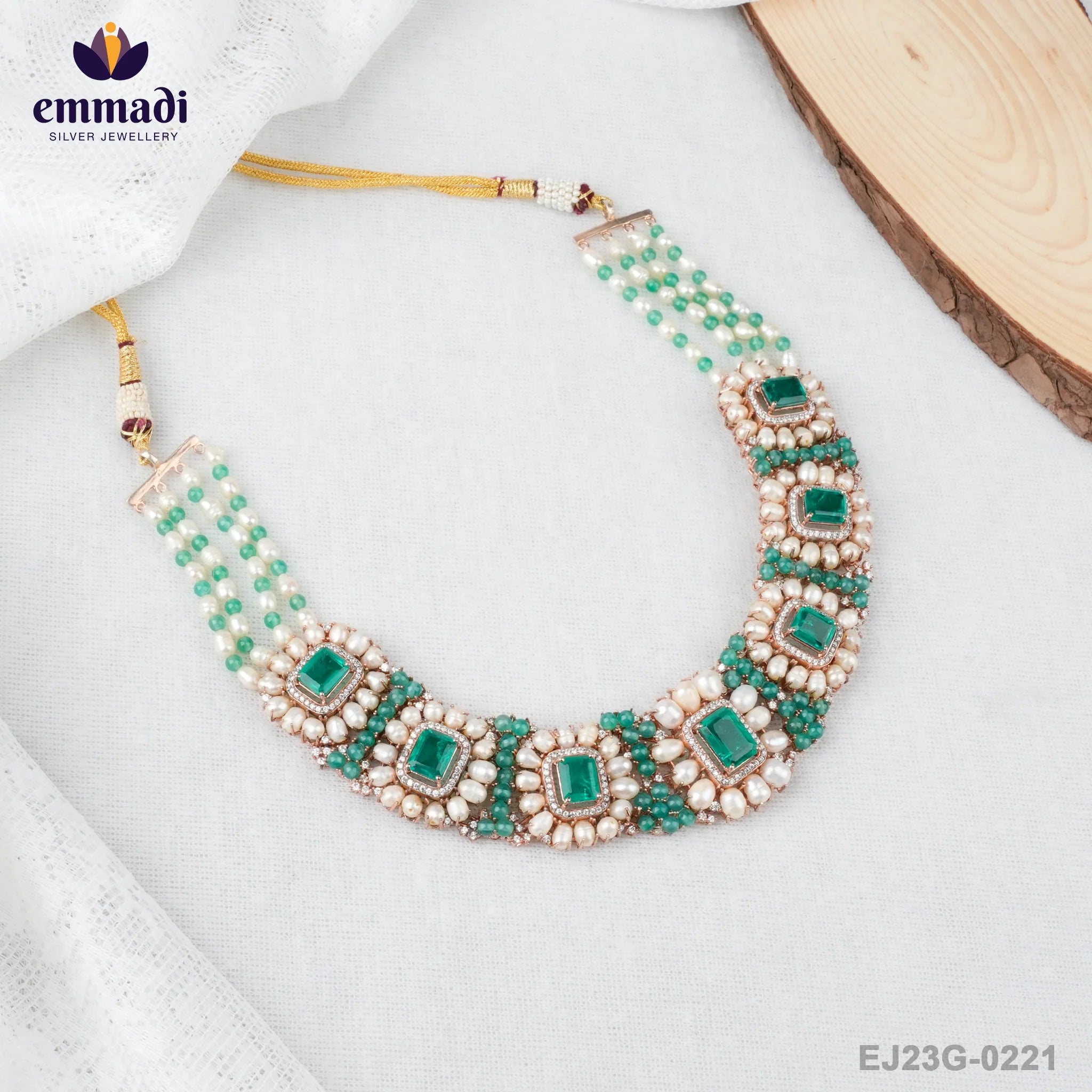 Discover the exquisite craftsmanship of Indian jewellery with Maya's Two Colour Stones Green Necklace. This stunning piece is handcrafted with precision and attention to detail, making it a true work of art. The necklace features a beautiful combination of green stones, set in pure 92.5 silver with gold plating.