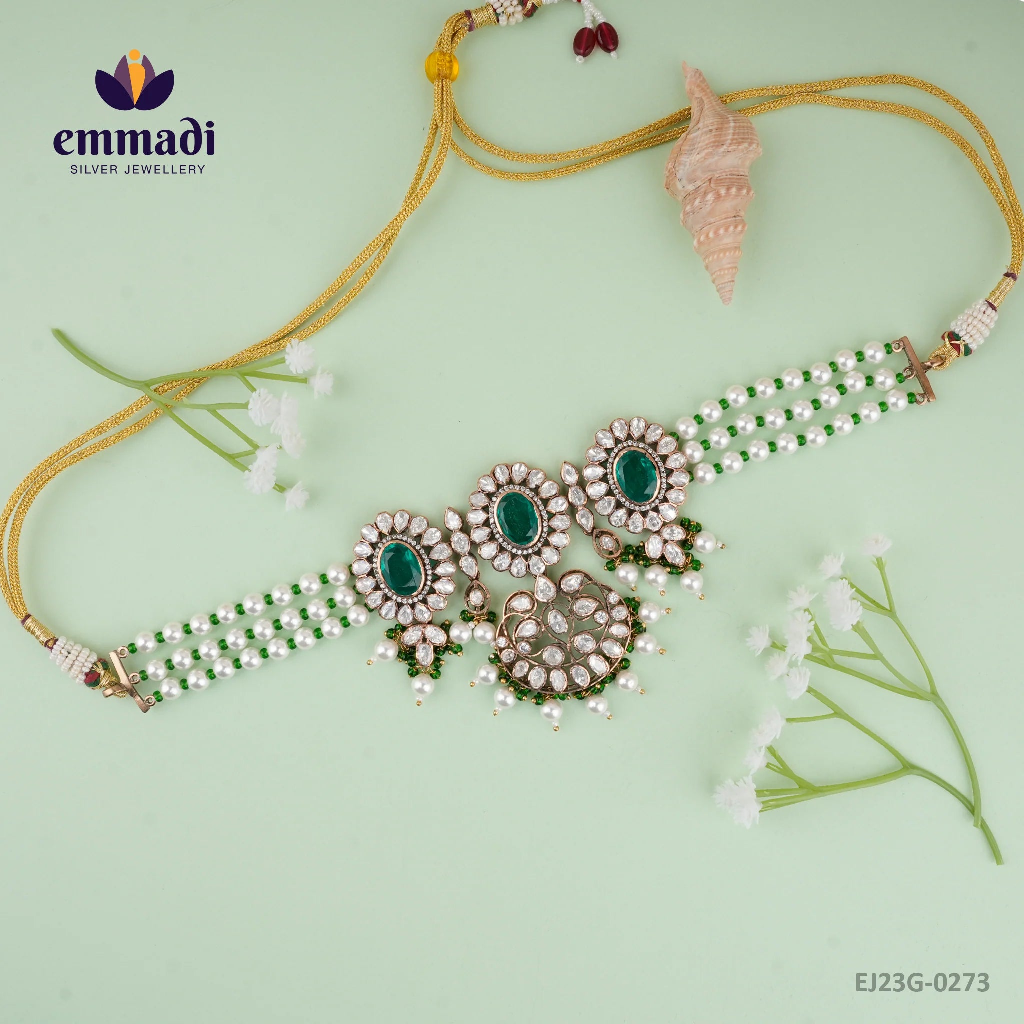 Indulge in the opulent allure of the Tarjani Victorian Green Choker by Emmadi Silver Jeweller, India's Largest silver brand. This exquisite choker exudes Victorian grandeur with its lush, green tones and intricate design. Elevate your style to new heights with this statement piece that embodies elegance and sophistication. Adorn yourself with the essence of luxury and let your beauty shine like never before.