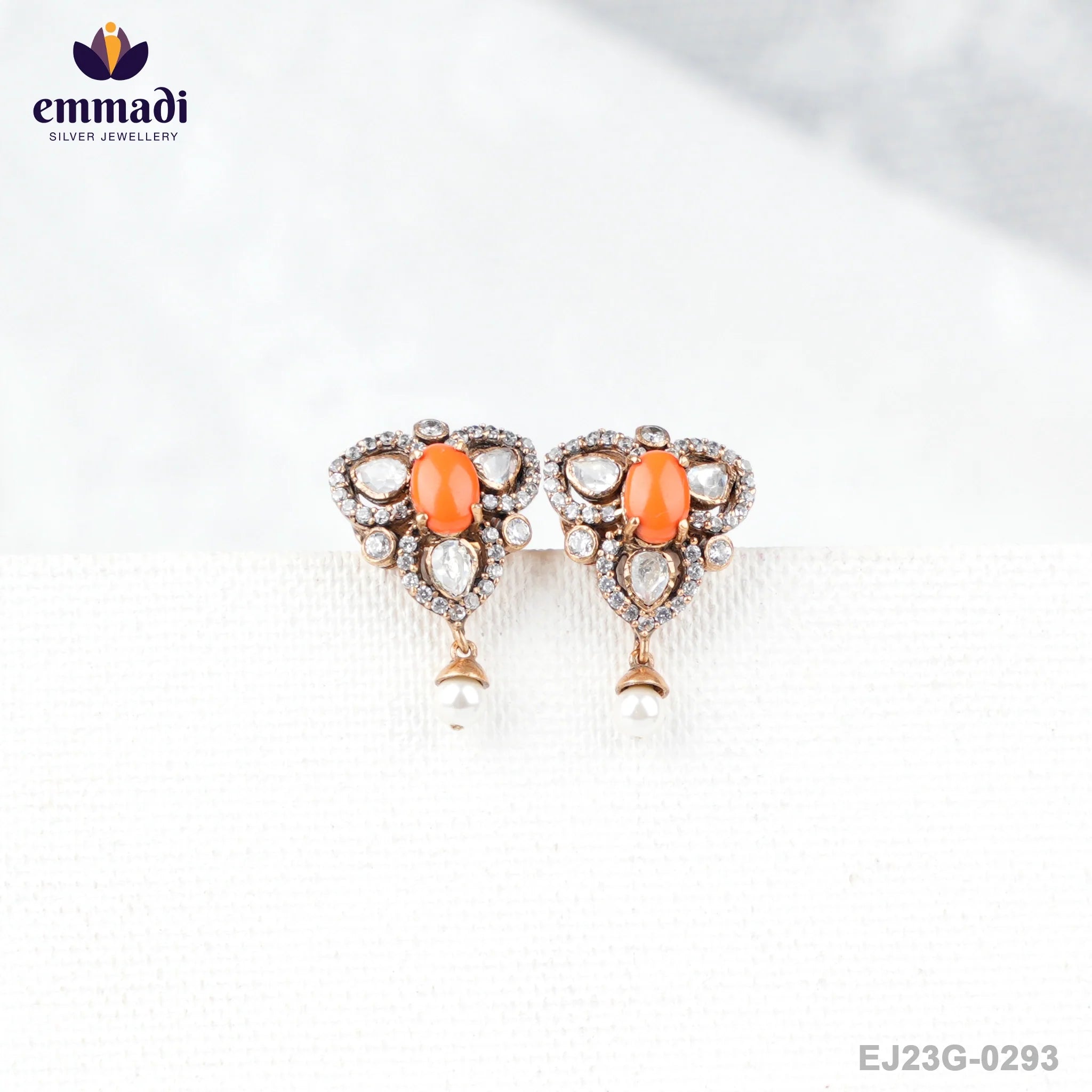 Our two-colour stones orange ear tops/studs are a stunning example of the craftsmanship and artistry that goes into creating our pieces. Handcrafted with pure gold plating and made with pure 92.5 silver, these ear tops/studs are a beautiful combination of traditional Indian design and modern style. The vibrant orange stones add a pop of color to any look, making them the perfect accessory for any occasion.