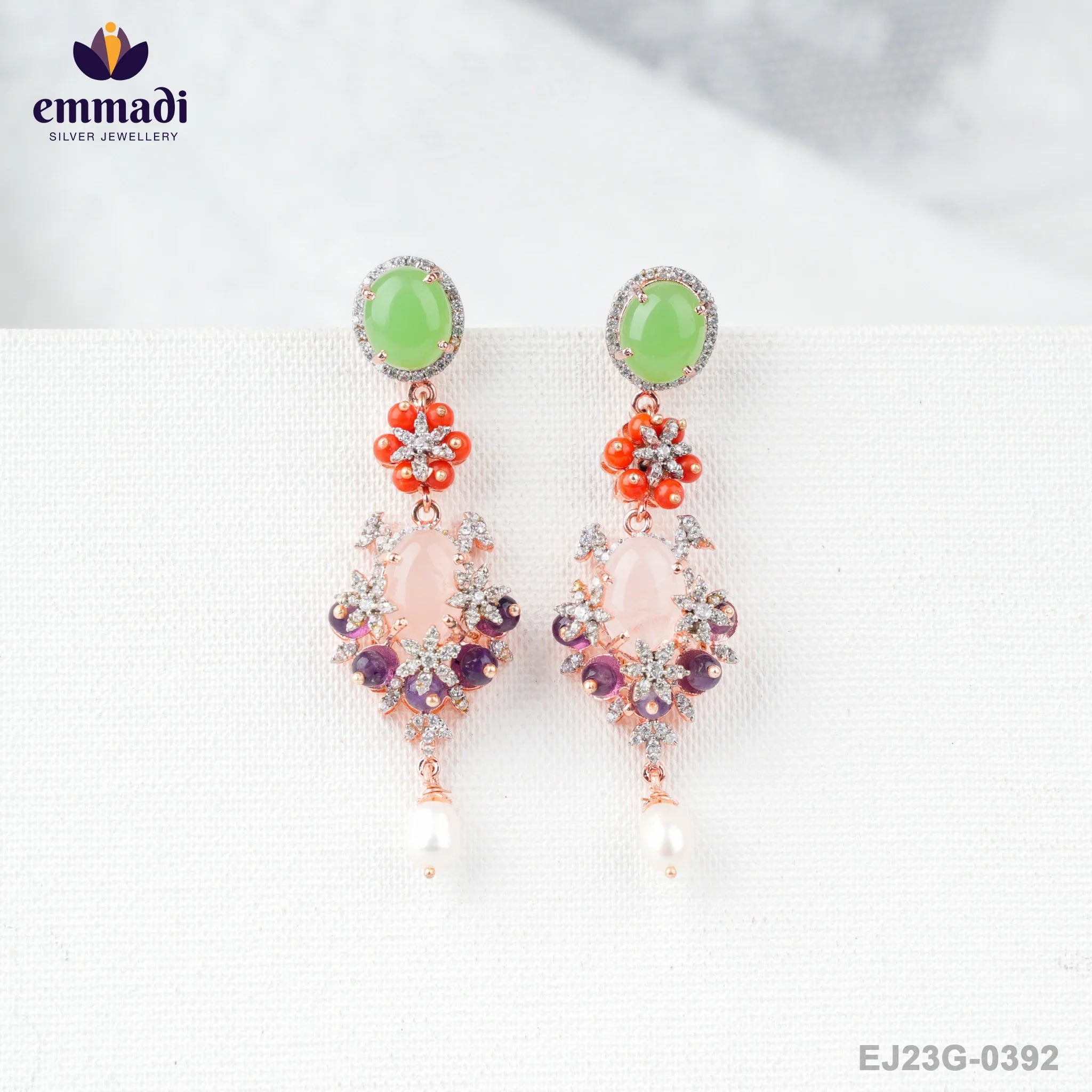 Our Two Colour Stones Multi Hangings are a true statement piece. These earrings feature a unique design that incorporates two different coloured stones in a multi-hanging style. The intricate detailing and craftsmanship make these earrings a work of art that will surely stand out in any crowd.