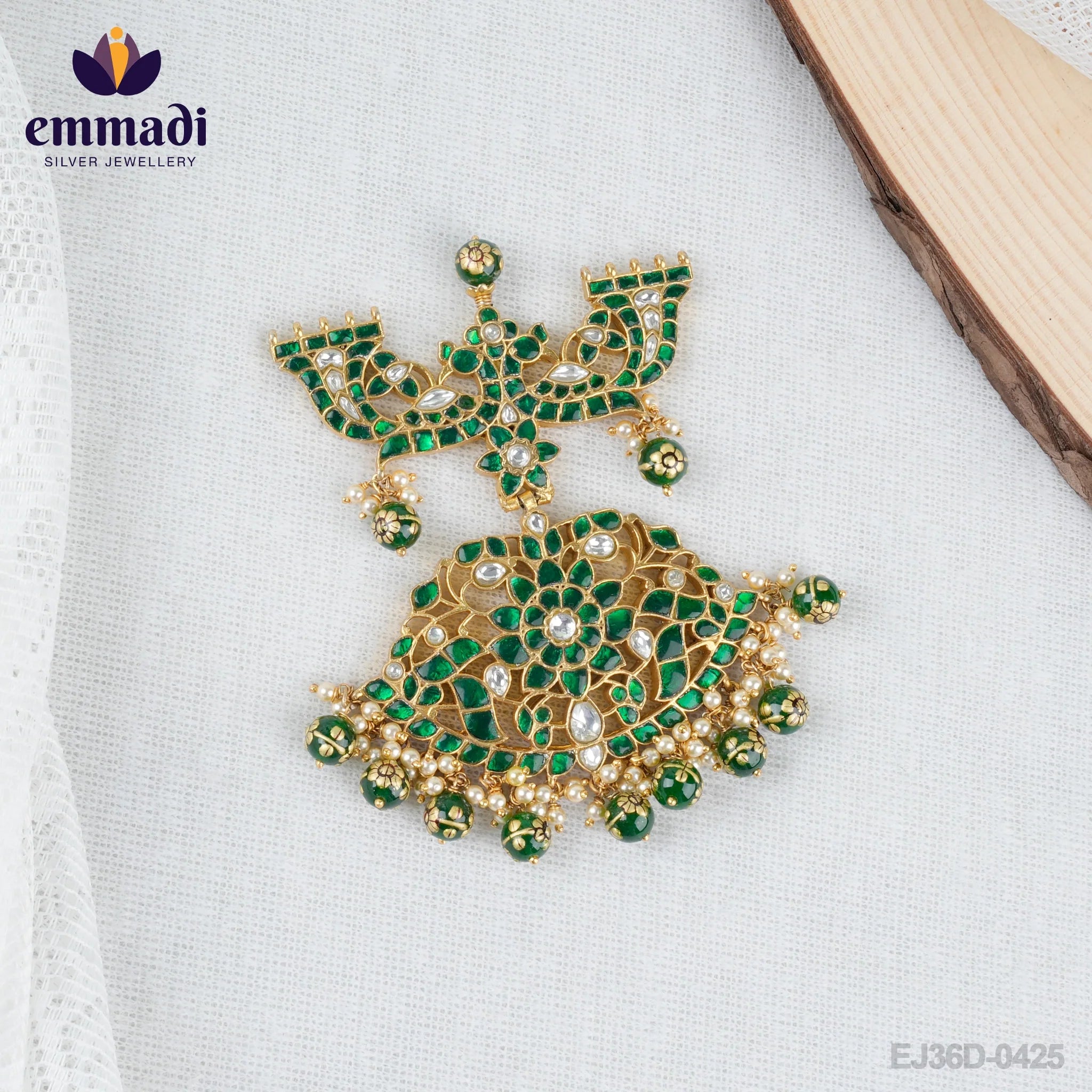 Indradhanush Pendant Kundan is a luxurious and intricately designed pendant handcrafted by Emmadi Jewellers. Made with 92.5 silver and pure gold plating, this pendant is a stunning piece of art that exudes elegance and sophistication.