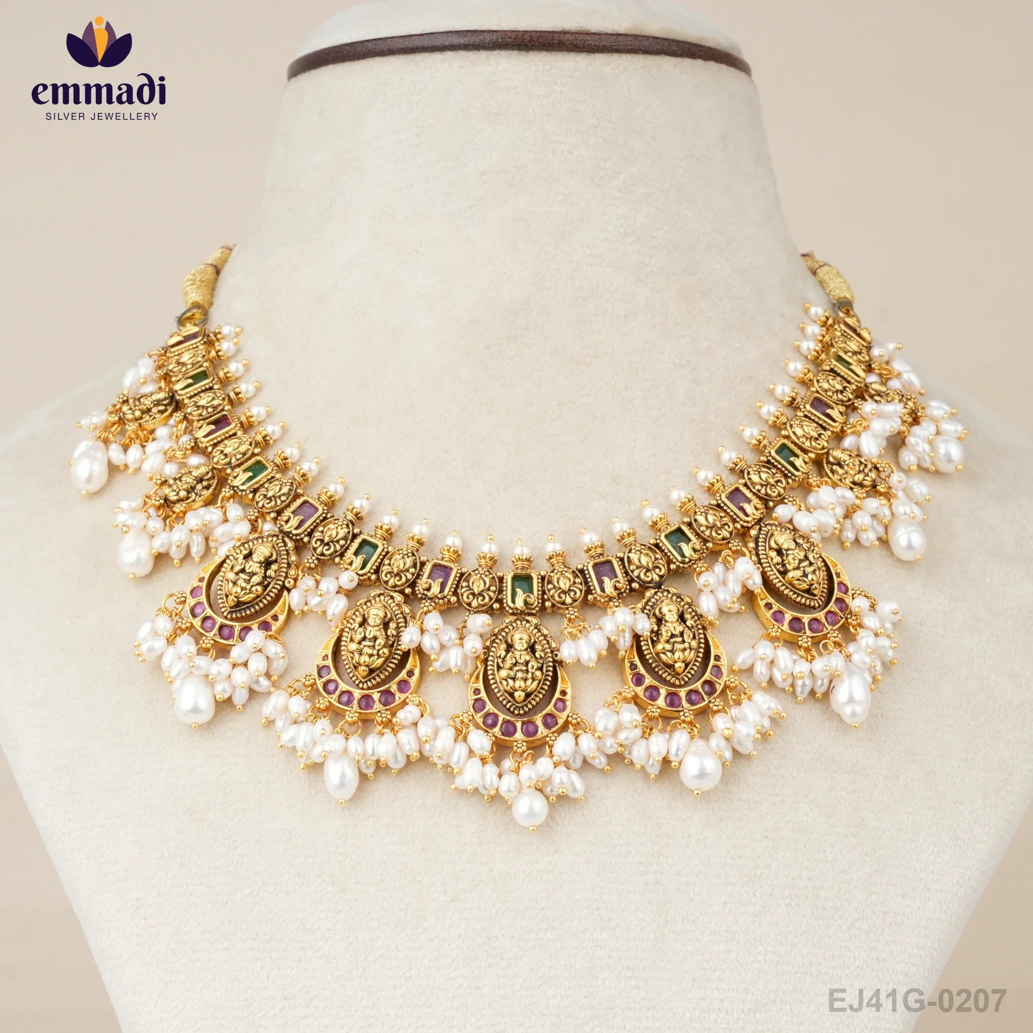 Indulge in the opulent beauty of the Kulamani Guttapusalu Multi Necklace, a masterpiece crafted by Emmadi Silver Jeweller, India's largest silver brand. Elevate your style with this exquisite necklace that exudes timeless elegance and sophistication. Adorned with intricate detailing and a touch of tradition, this necklace is a true symbol of luxury and craftsmanship. Make a bold statement and showcase your impeccable taste with the Kulamani Guttapusalu Multi Necklace.